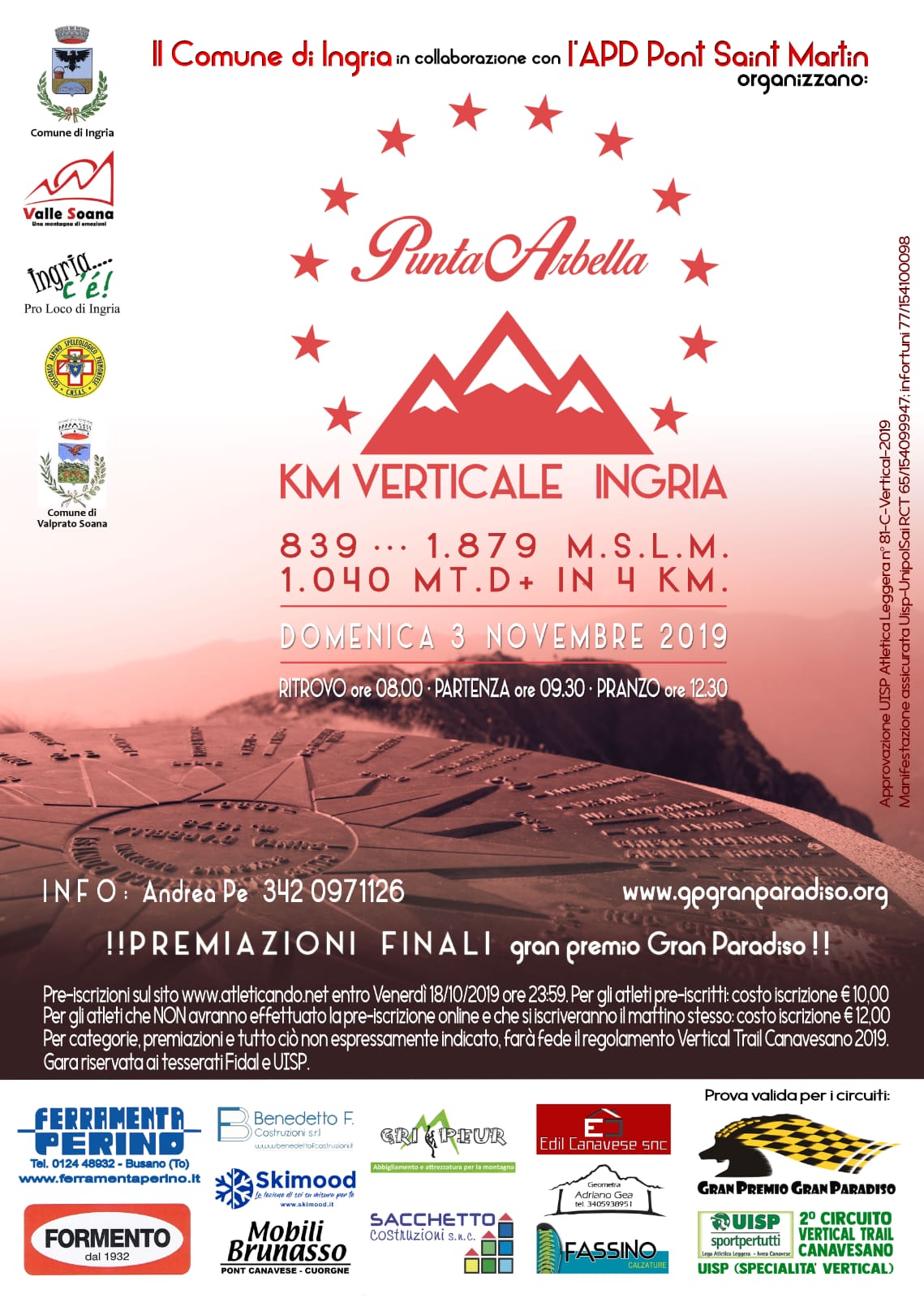 L' APD Pont Saint Martin in collaborazione con il Comune di Ingria e Pro Loco di Ingria organizza la terza edizione del Km verticale INGRIA-P.ta Arbella: ritrovo alle ore 8, partenza alle 9.30 e al termine pranzo presso il salone della Pro Loco di Ingria.