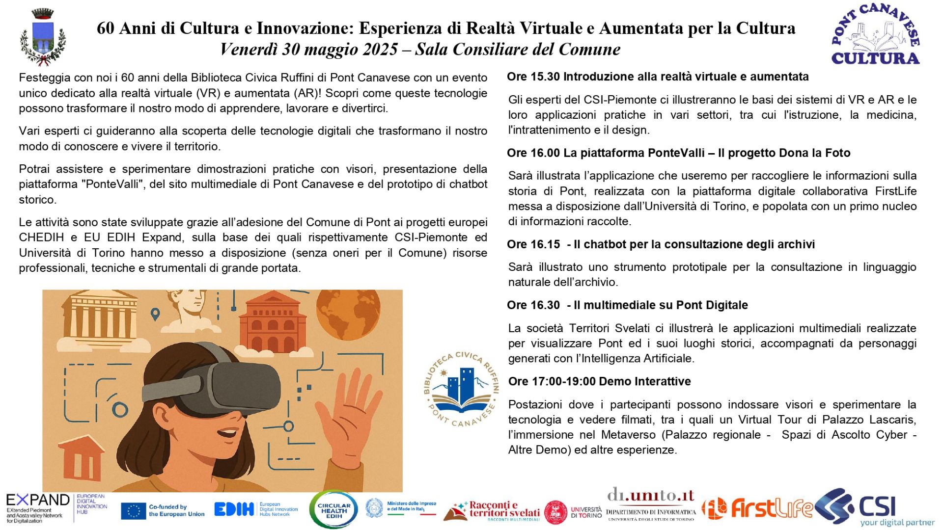 In occasione del 60° anniversario dell'istituzione della Biblioteca Civica Ruffini, ricorrente il 31 maggio 2025, si invita tutta la cittadinanza a partecipare ad un evento unico, dedicato alla realtà virtuale (VR) e aumentata (AR), venerdì 30 maggio dalle ore 15.30 alle ore 19.30 presso la Sala Consiliare del Comune.
