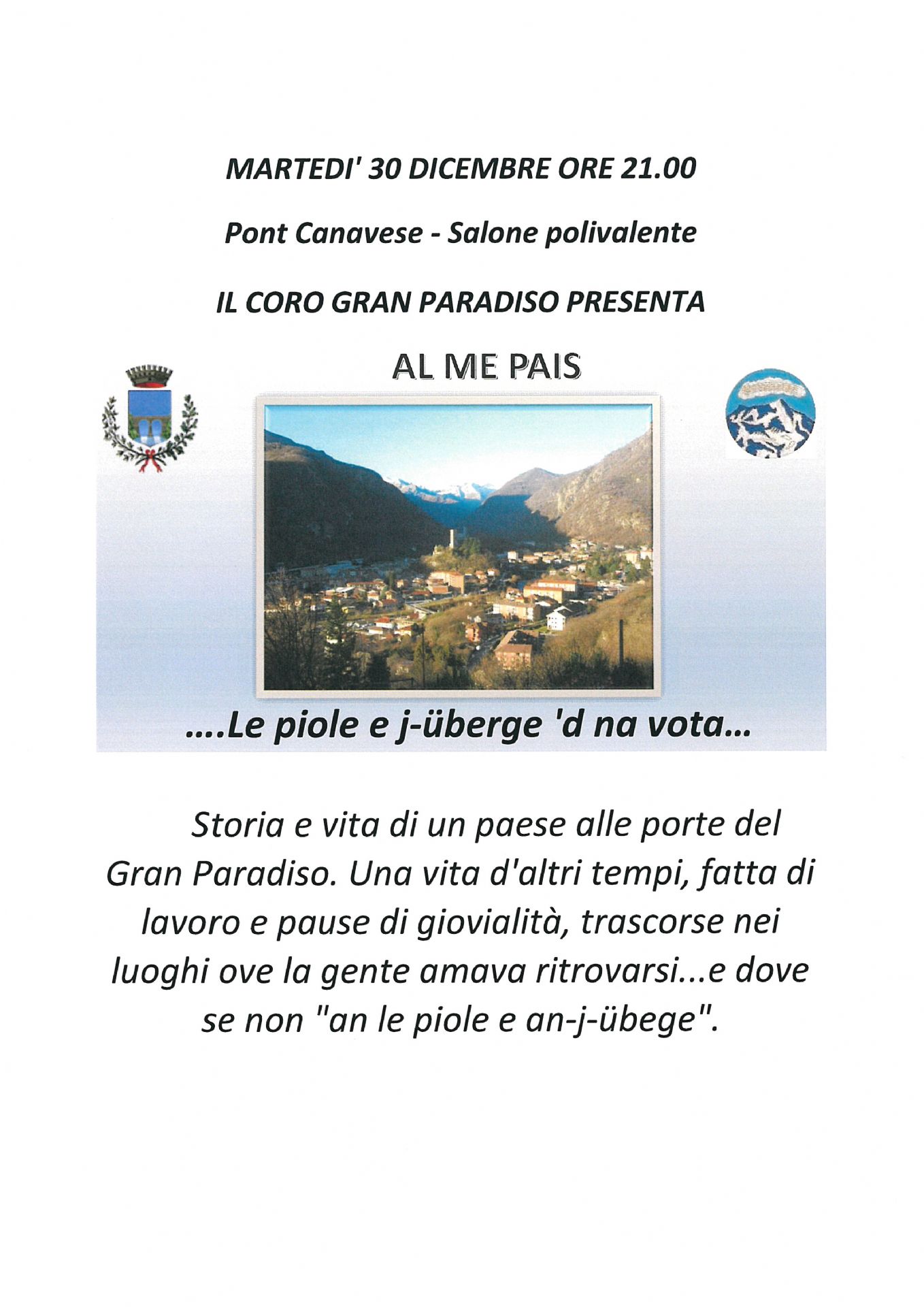 Martedì 30 dicembre 2025 ore 21.00 - Salone polivalente in via Soana 32 - Pont Canavese