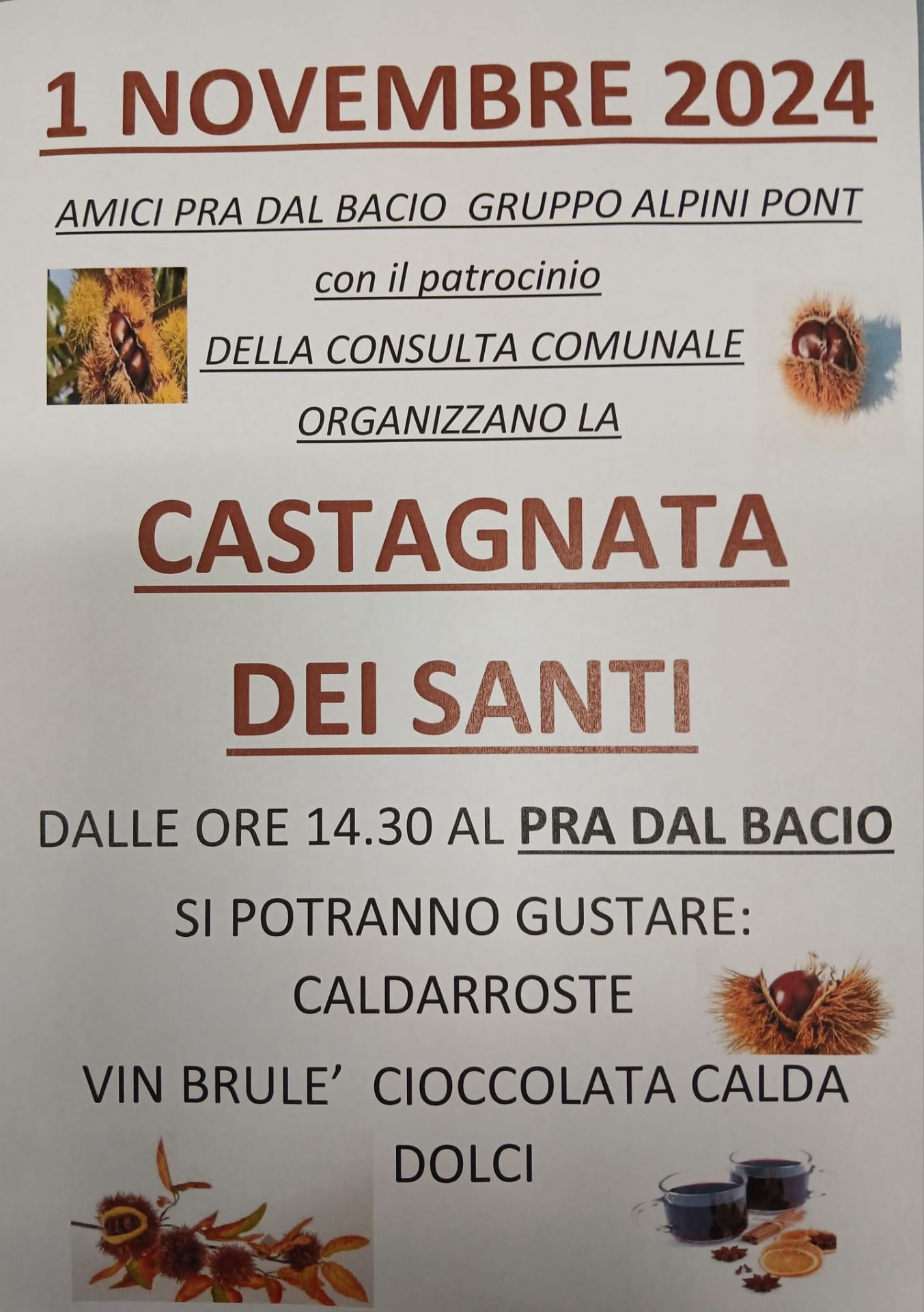 L'Associazine Amici Pra dal bacio con il Gruppo Alpini di Pont organizza la Castagnata dei Santri per il 1° novembre 2024 dalle ore 14:30
