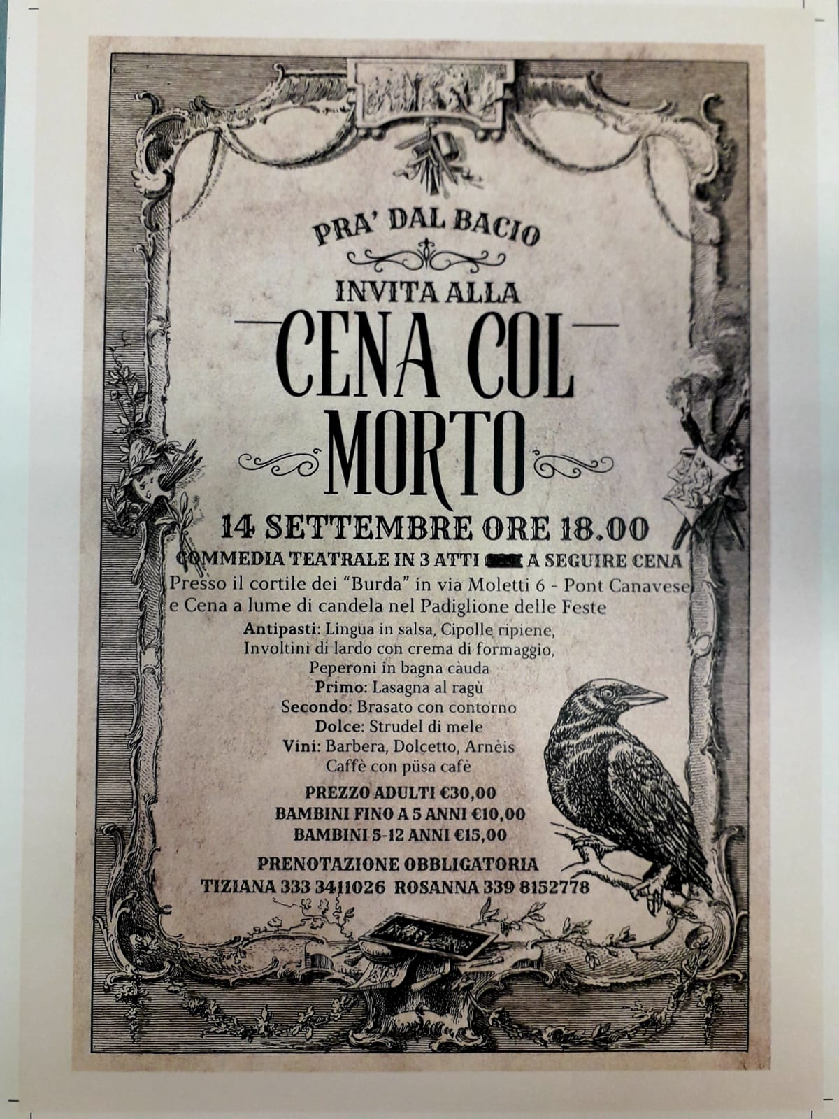 L'Associazione "Prà dal Bacio" invita alla Cena col morto, commedia teatrale in 3 atti con cena finale.