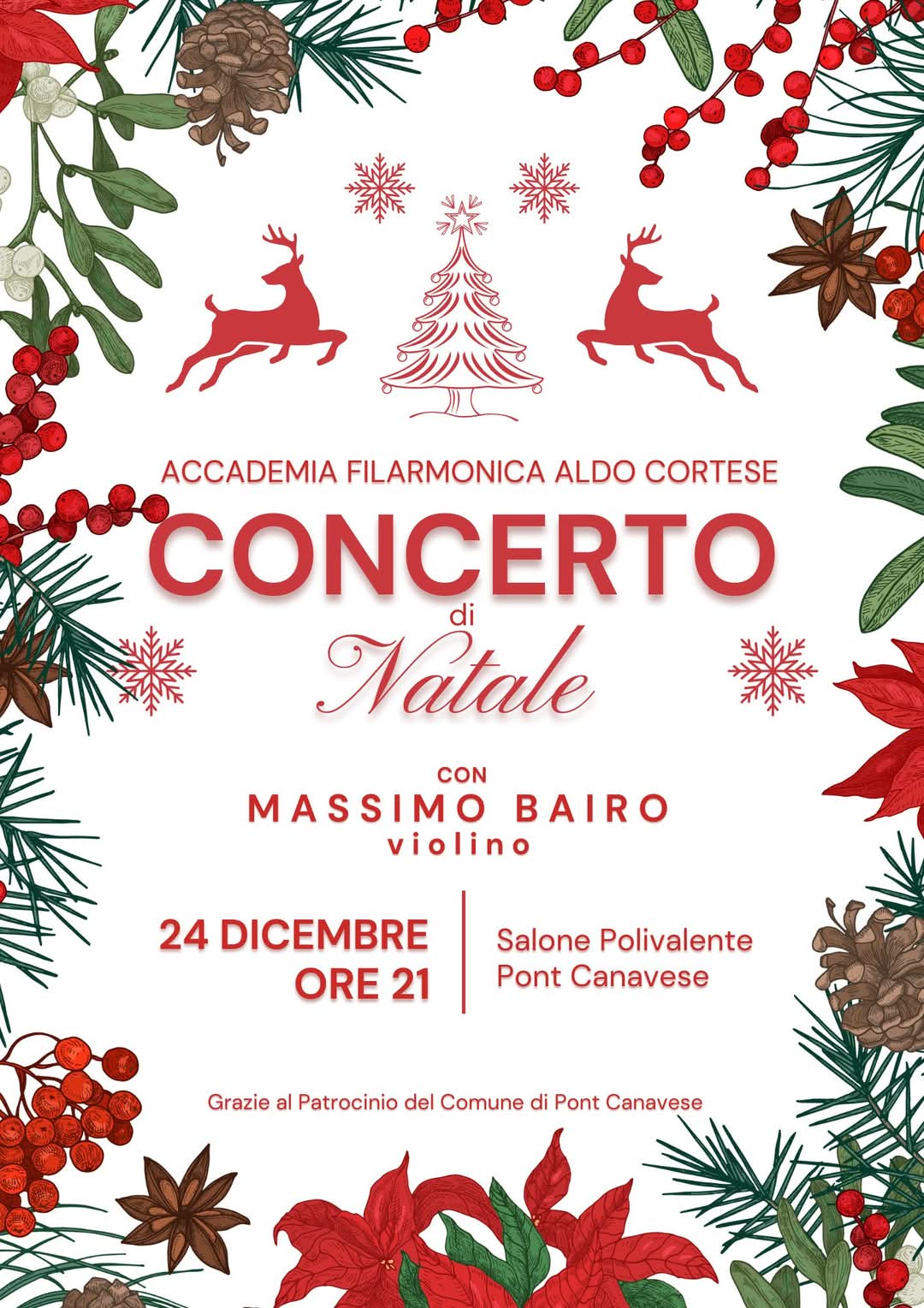 Martedì 24 dicembre 2024 alle ore 21.00, presso il Salone Polivalente di Pont Canavese, l'Accademia Filarmonica Aldo Cortese con il patrocinio del Comune di Pont Canavese, presenta il tradizionale "Concerto di Natale" con la partecipazione straordinaria di Massimo Bairo, violino solista.