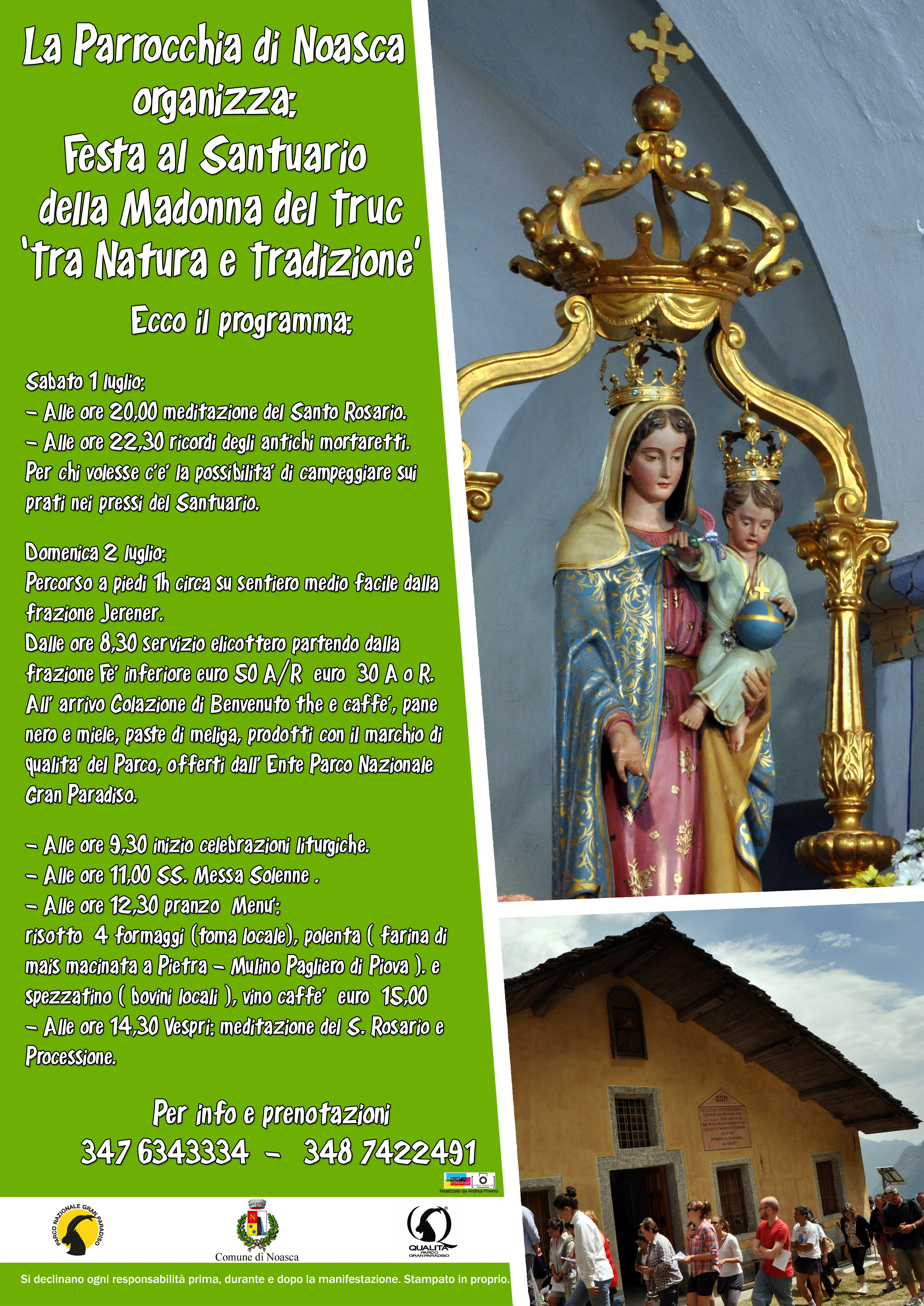 La Parrocchia di Noasca organizza la consueta festa al Santuario mariano della Madonna del Truc, dedicato alla visitazione di Maria Vergine a Santa Elisabetta in seguito a miracolosa apparizione lungo il sentiero che sale dalla borgata Jerener di Noasca all’alpeggio Truc, situato in posizione dominante a circa 1300 mt di altezza. La venerazione a questo Santuario risale ad antica data: se ne trovano tracce nelle visite pastorali di fine 1600, ma l’inizio del culto è da considerarsi ancora più antico. Più volte ampliata perché distrutta da valanghe, oggi si presenta una chiesa semplice ma ben curata e risulta uno dei Santuari meglio conservati e maggiormente frequentati in tutta la valle.