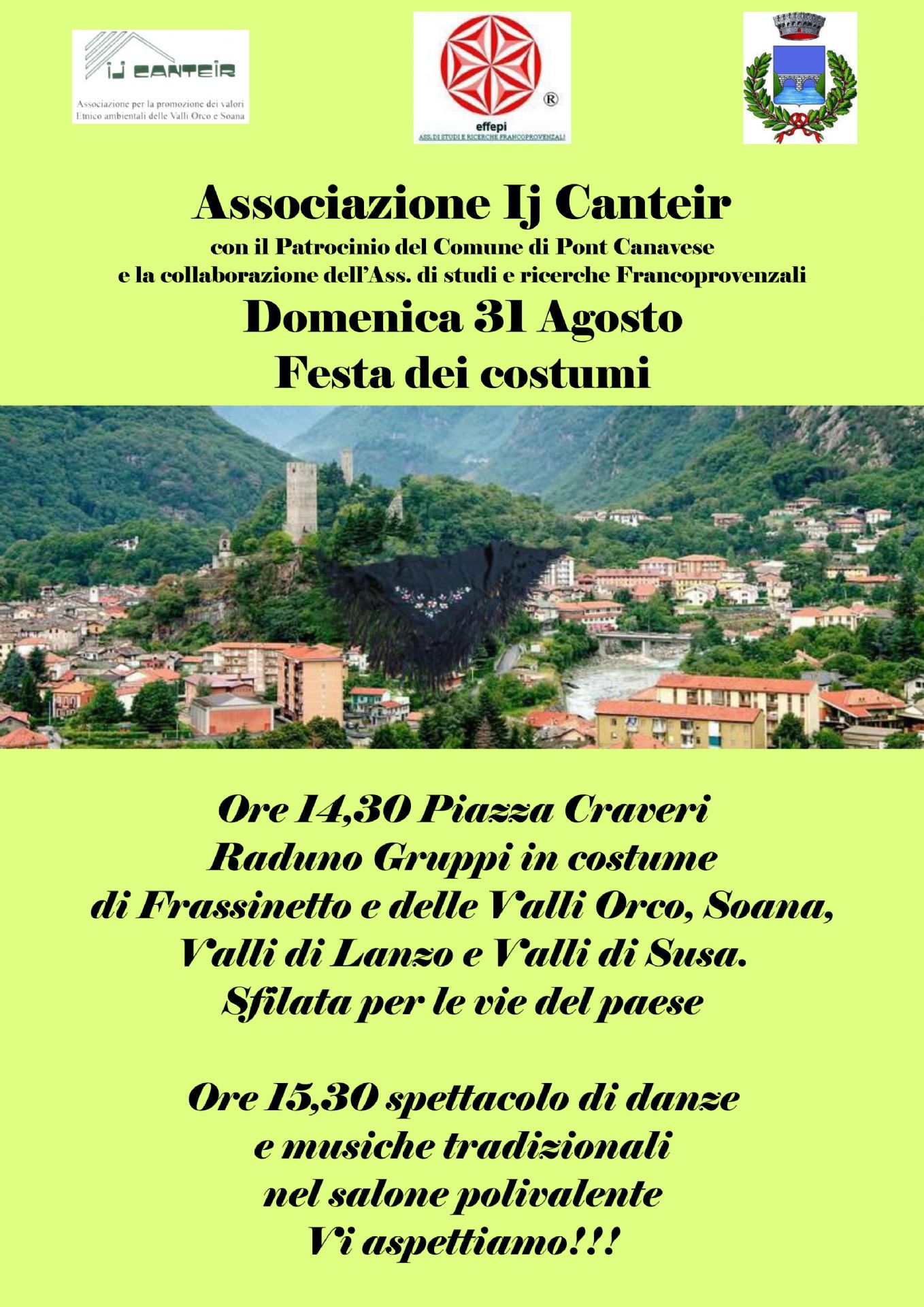 Festa dei Costumi, organizzata dall'Associazione Ij Canteir, con il Patrocinio del Comune di Pont Canavese e la collaborazione dell' Associazione studi e ricerche Francoprovenzali.