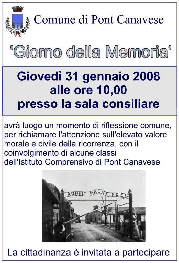 Presso la sala consiliare alle ore 10 avrà luogo un momento di riflessione comune, per richiamare l'attenzione sull'elevato valore morale e civile della ricorrenza, con il coinvolgimento di alcune classi dell'Istituto Comprensivo di Pont Canavese