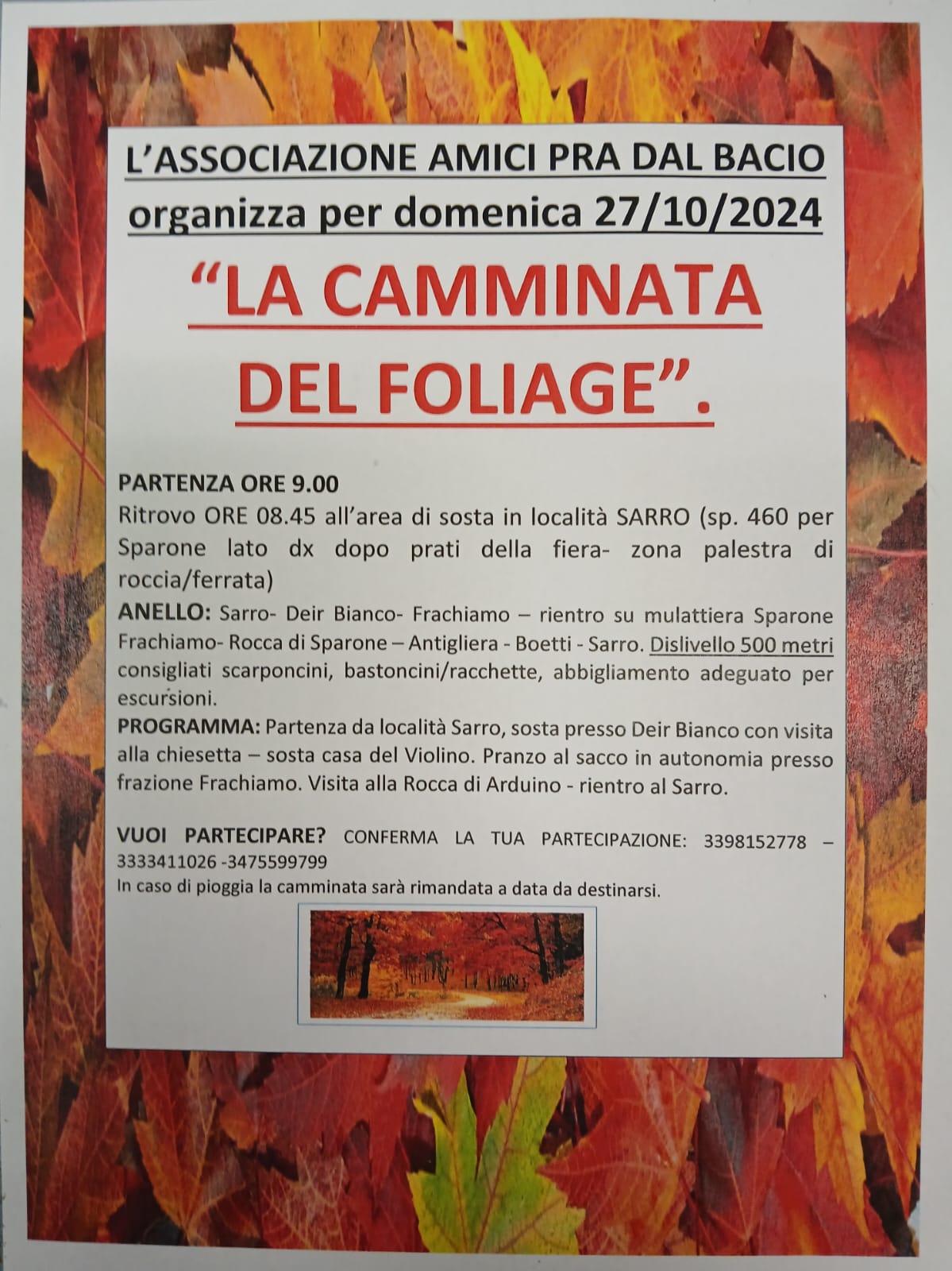 L'Associazione Amici Pra dal bacio organizza per domenica 27 ottobre 2024 "La camminata del foliage"