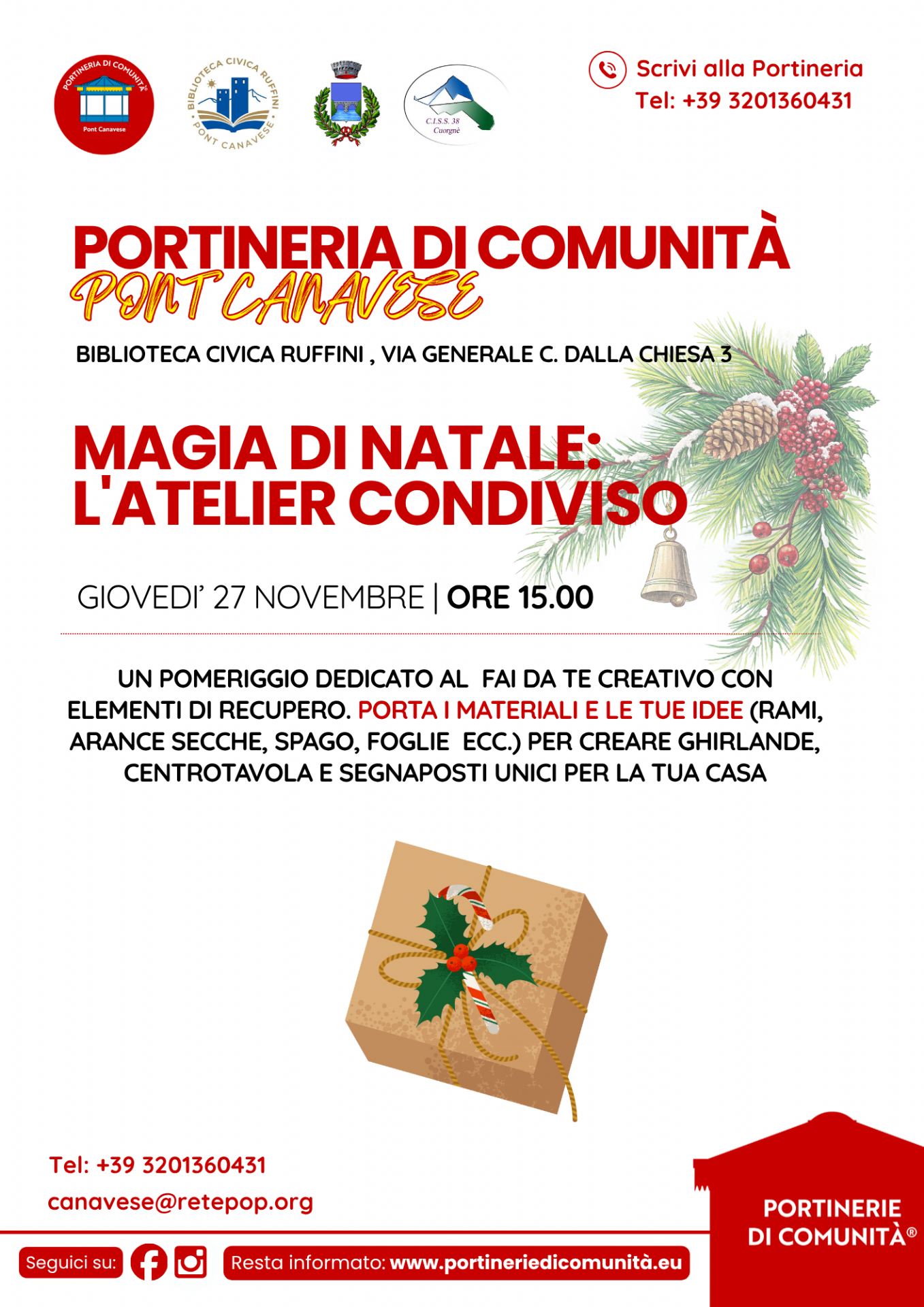 Porta i materiali e le tue idee (rami, arance secche, spago, foglie ecc.) per creare ghirlande, centrotavola e segnaposti unici per la tua casa.