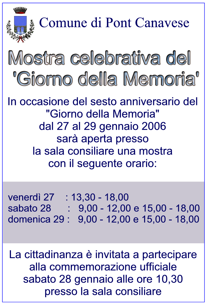 In occasione del sesto anniversario del "Giorno della memoria" sarà aperta presso la sala consiliare una mostra celebrativa con il seguente orario: