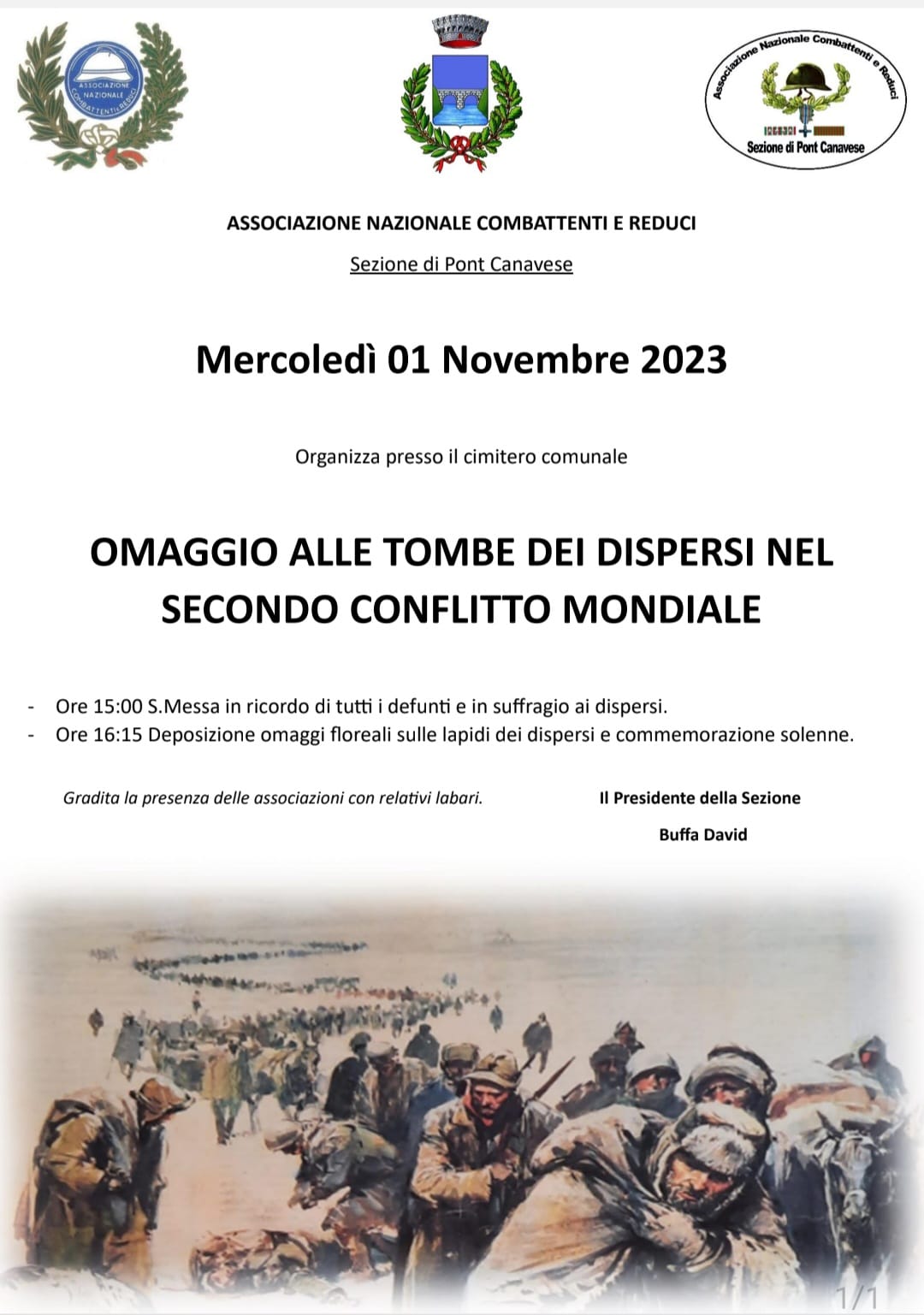 L'Associazione Combattenti e Reduci - Sezione di Pont Canavese - organizza presso il cimitero comunale l'Omaggio alle tombe dei dispersi nel secondo conflitto mondiale.