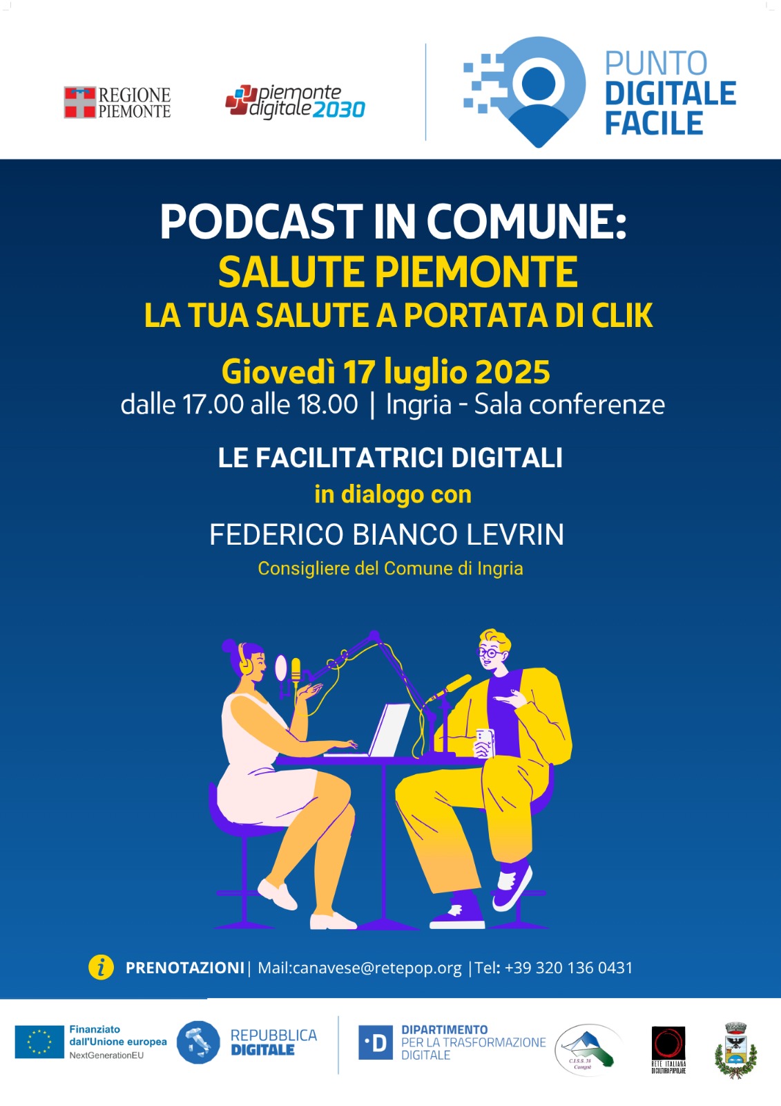 Il 17 luglio 2025, dalle ore 17:00 alle 18:00, la sala conferenze del Comune di Ingria ospiterà un evento innovativo e coinvolgente: “Podcast in Comune – Salute Piemonte: la tua salute a portata di clic”.