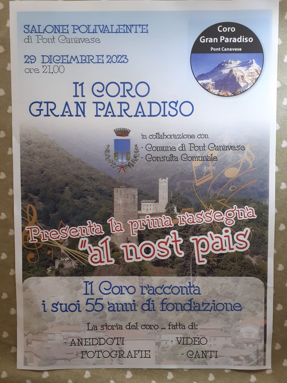 Il Coro Gran Paradiso racconta i suoi 55 anni di fondazione con la prima rassegna "Al nost pais", venerdì 29 dicembre 2023 alle ore 21.00, presso il Salone Polivalente di Pont Canavese, Via Soana 32.