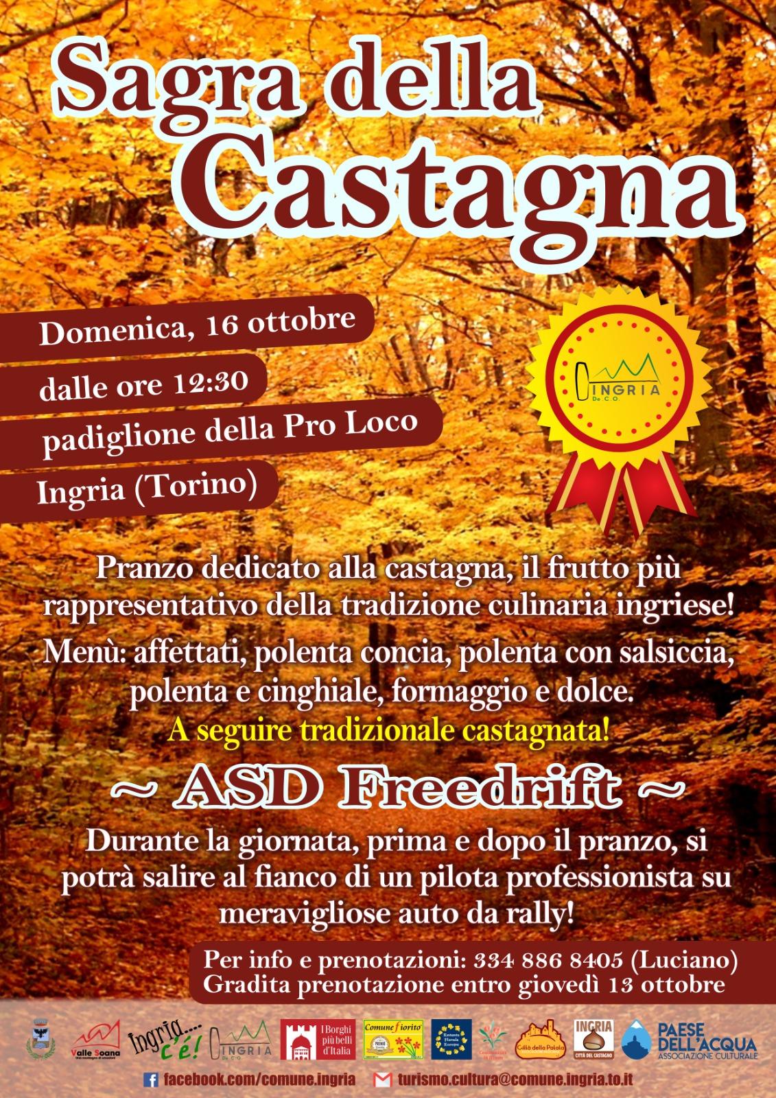 Il Comune di Ingria in collaborazione con la Pro Loco e ASD Freedrift organizzano il pranzo dedicato alla castagna, il frutto più rappresentativo della tradizione culinaria ingriese!