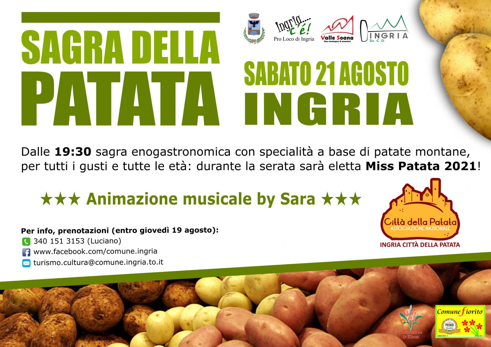 Sabato 21 agosto si terrà a Ingria la consueta Sagra della Patata: a partire dalle ore 19.30 cena con premiazione del concorso Ingriese dei "Balconi Fioriti”.
