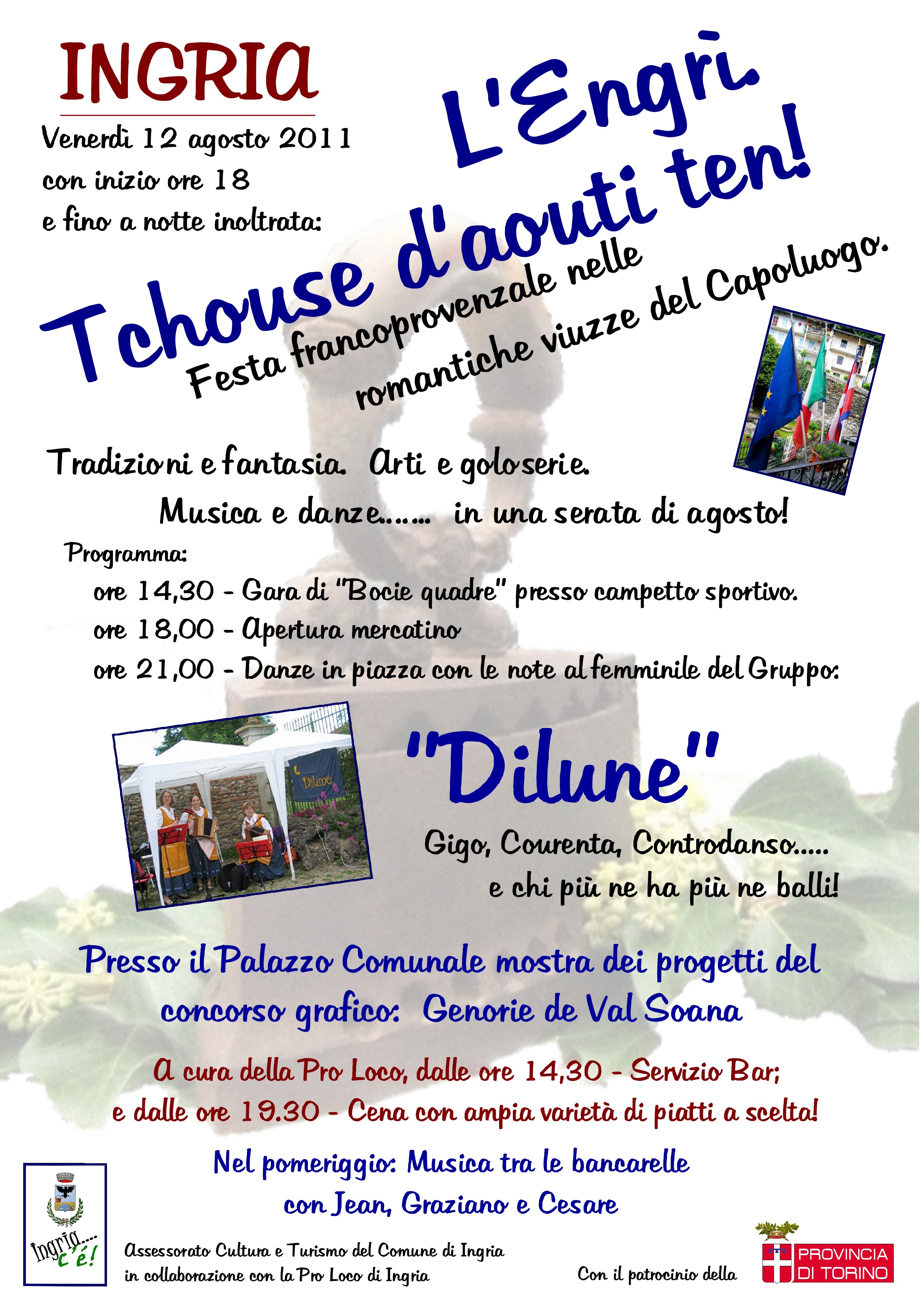 Ingria - Tchose d'aouti tenIl Sindaco di Ingria, Igor De Santis, dice: “la manifestazione “Tchose d’aouti ten” oltre ad essere un degli eventi principali del nostro comune, in quanto porta parecchi turisti e visitatori, è anche il giorno in qui le vecchie tradizioni e le origini delle nostre montagne si prendo la rivincita con quanti pensano siano morte. Credo infatti che oltre ad essere un momento per far conoscere il tesoro culturale lasciatoci dai nostri avi sia anche un modo per far capire che la montagna e le nostre valli sono vive e pronte a farsi conoscere da chi abbia piacere di passa un po’ di tempo a contatto con la natura“.