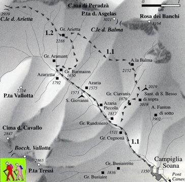 Si continua invece sulla stradina e si attraversa per intero la bella Piana d'Azaria (quota 1575). Arrivati al fondo della piana, si abbandona la strada per seguire sulla destra una traccia di sentiero che si dirige verso le Grange del Barmaion; si sale per prati e tracce sino a raggiungere il limitare del bosco, dove si incontra il sentiero che porta alle Grange dell'Arietta.