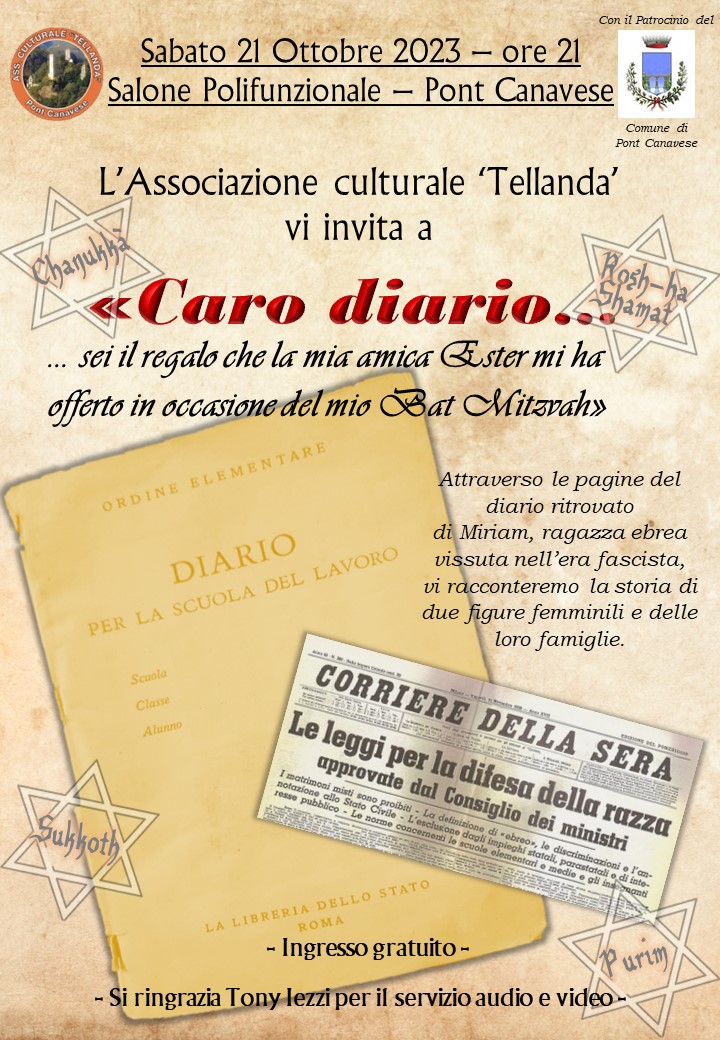 L'Associazione culturale "Tellanda" di Pont Canavese con il patrocino del Comune di Pont Canavese, ha organizzato per sabato 21.10.2023 alle ore 21.00 una serata teatrale di racconto e riflessione sul tema : "Le leggi razziali in Pont e Canavese".