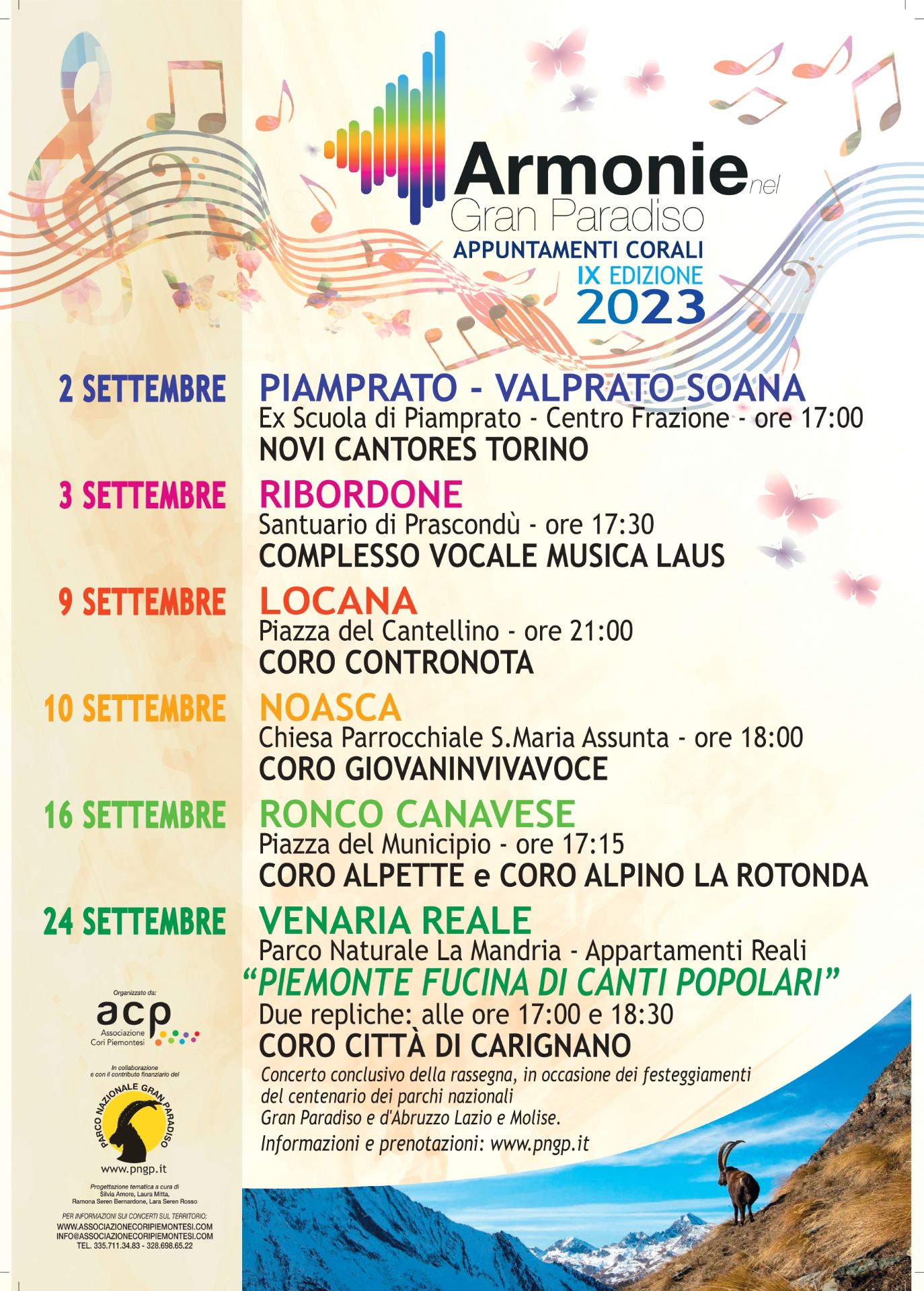 Torna la consueta rassegna corale "Armonie nel Gran Paradiso", organizzata da Associazione Cori Piemontesi in collaborazione e con il contributo finanziario dell'Ente Parco Nazionale Gran Paradiso, con concerti di cori da tutto il Piemonte ed esibizioni in suggestive location immerse nella natura.