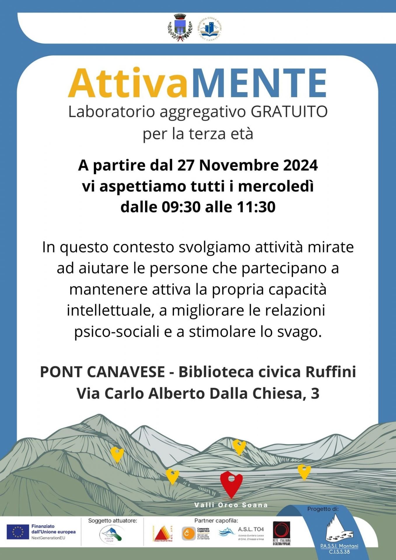 A partire dal 27 novembre 2024, tutti i mercoledì dalle 09:30 alle 11:30, presso la Biblioteca Civica Ruffini di Pont Canavese.