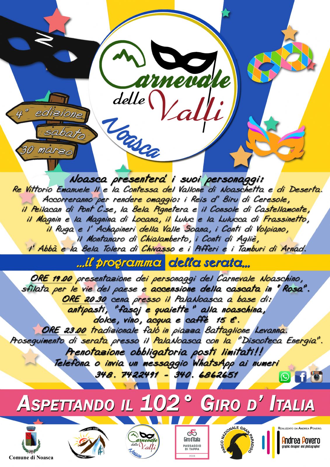 N.B. Dato il grande successo che ormai da anni riscuote il nostro Carnevale, informiamo che le prenotazioni per la cena presso il PalaNoasca sono state chiuse poiché si è raggiunto in brevissimo tempo il numero massimo stabilito. Per questo motivo invitiamo tutti coloro che volessero comunque partecipare alla nostra festa a contattare i ristoranti noaschini che, per l'occasione, vi proporranno i loro menù!