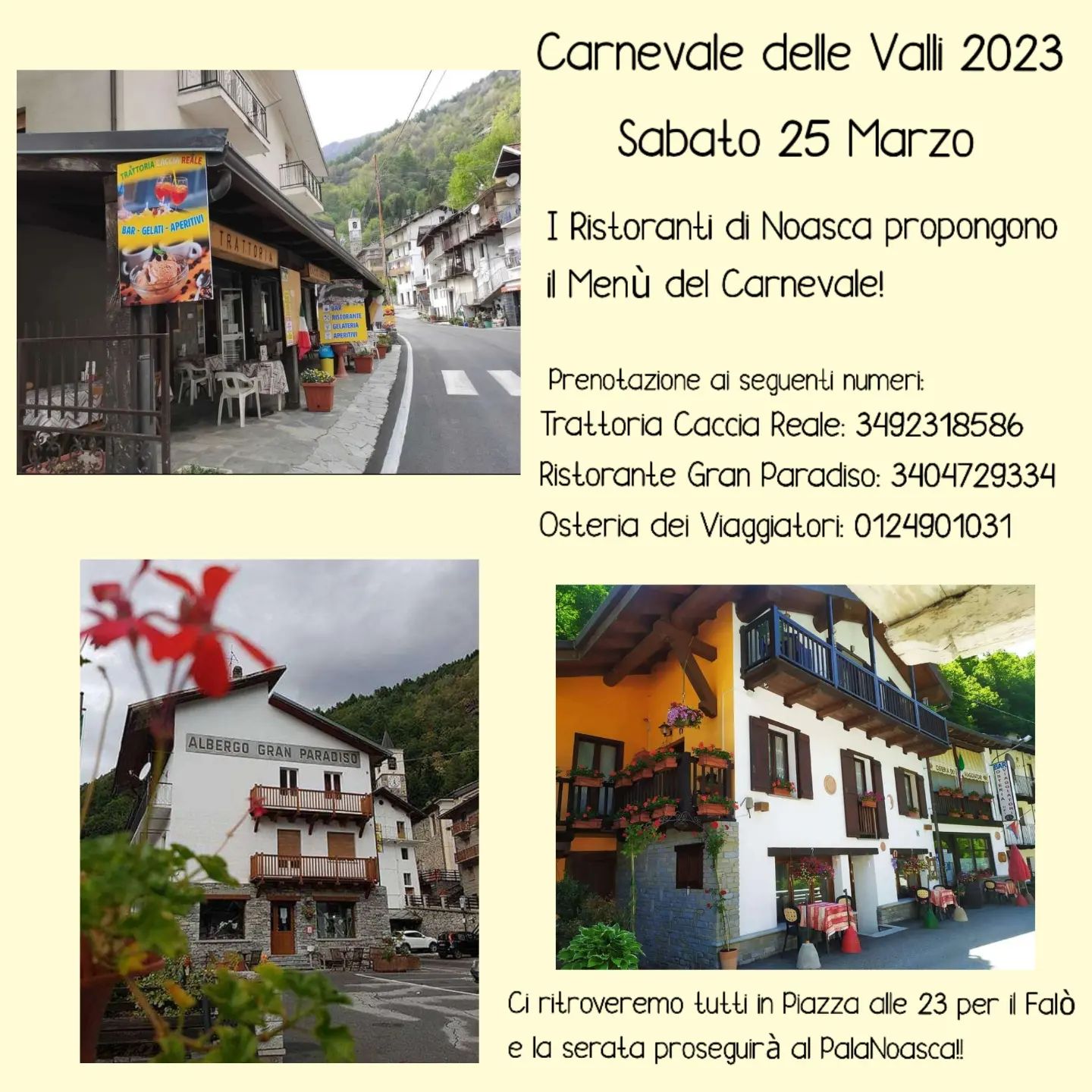 I RISTORANTI di Noasca, in un'ottica di unione e collaborazione, per la serata di SABATO 25 MARZO propongono il Menù del CARNEVALE delle VALLI.