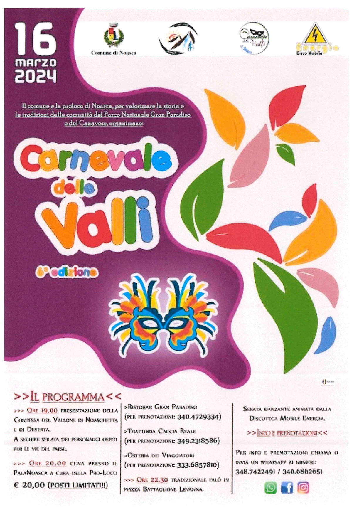 Il Comune e la Proloco di Noasca, per valorizzare la storia e le tradizioni della comunità del Parco Nazionale Gran Paradiso e del Canavese, organizzano la sesta edizione del CARNEVALE DELLE VALLI.
