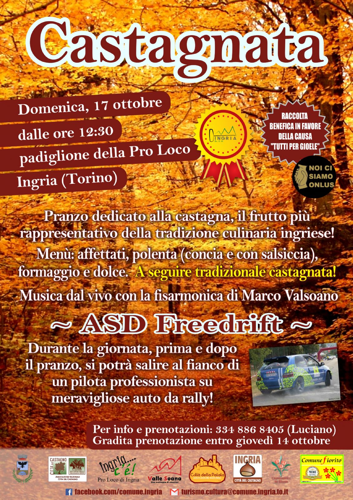 Il Comune di Ingria in collaborazione con la Pro Loco e ASD Freedrift organizzano il pranzo dedicato alla castagna, il frutto più rappresentativo della tradizione culinaria ingriese!