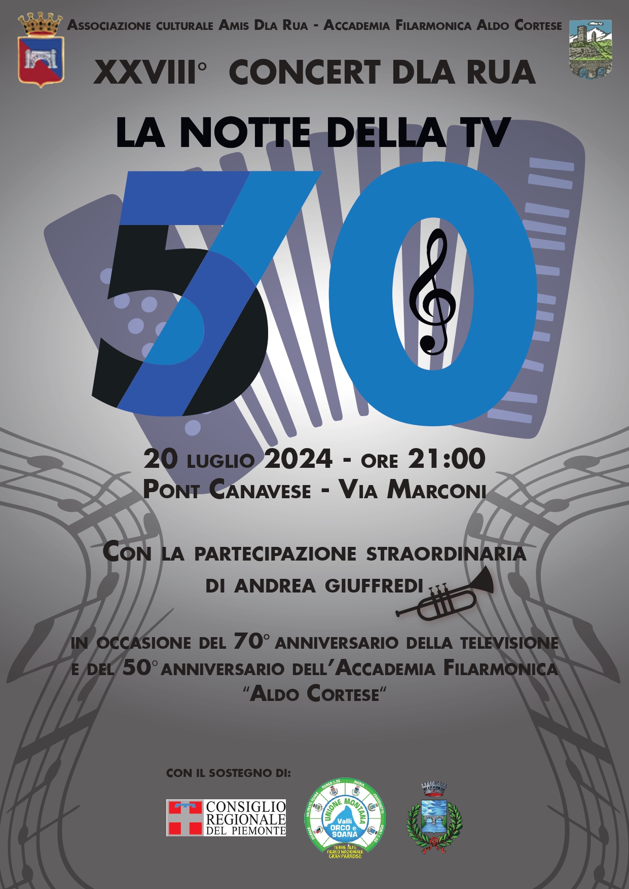 L’Accademia Filarmonica Aldo Cortese celebra quest’anno i suoi primi 50 anni e lo farà insieme a tutto il pubblico sabato 20 luglio a Pont Canavese con il tradizionale "Concert dla Rua" il concerto dei balconi.
