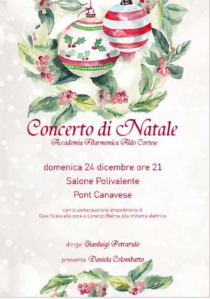 Domenica 24 dicembre 2023 alle ore 21.00, presso il Salone Polivalente di Pont Canavese, l'Accademia Filarmonica Aldo Cortese, presenta il "Concerto di Natale" con la partecipazione straordinaria di Gaia Scala alla voce e Lorenzo Balma alla chitarra elettrica.