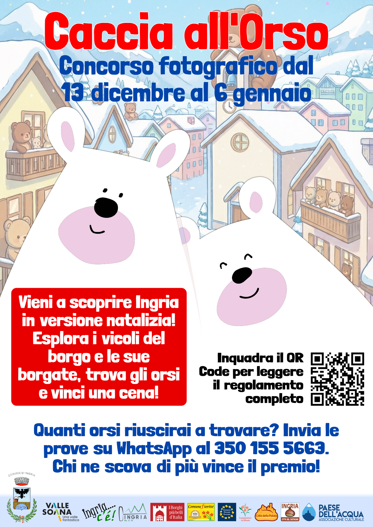 Partecipate a questa sfida fotografica e cercate di "catturare" il maggior numero di orsi di peluche esposti nel nostro Capoluogo e nelle sue Frazioni! Gli orsi dovranno essere fotografati e descritti: ogni singola foto dovrà infatti essere accompagnata dall'elenco degli orsi individuati; il concorso vale su tutto il territorio di Ingria.