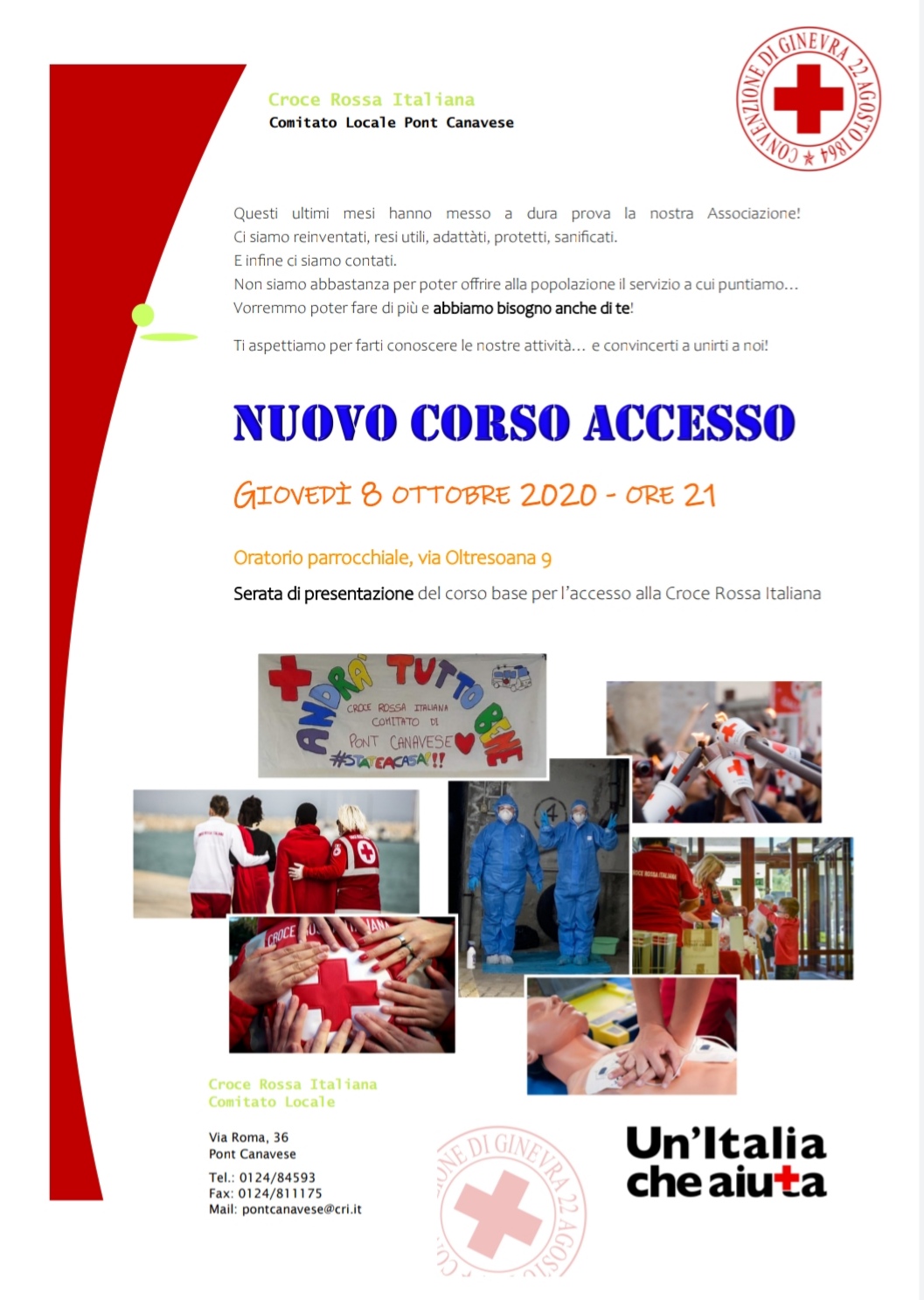 GIOVEDÌ 8 OTTOBRE 2020 ALLE ORE 21.00 PRESSO L'ORATORIO PARROCCHIALE DI PONT CANAVESE, SI SVOLGERÀ LA SERATA DI PRESENTAZIONE DEL CORSO DI ACCESSO ALLA CROCE ROSSA ITALIANA.