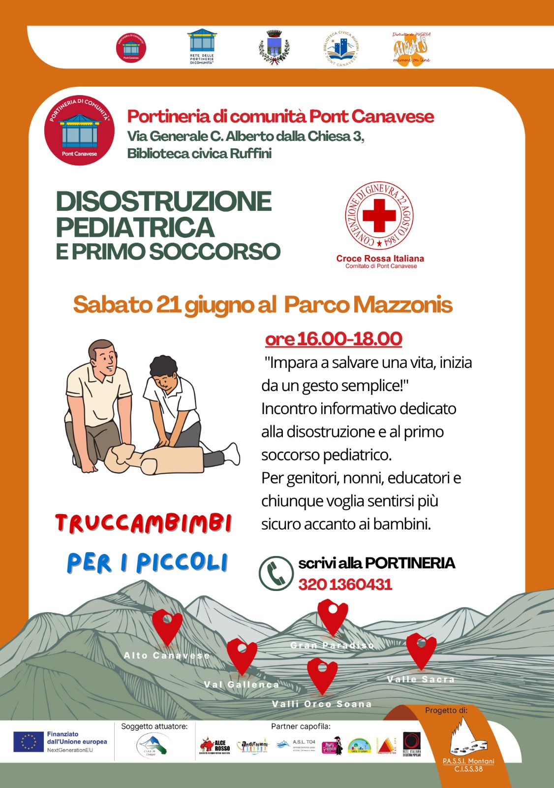 La Portineria di comunità di Pont Canavese organizza un evento informativo, aperto a tutta la cittadinanza, dedicato alla disostruzione pediatrica e al primo soccorso, sabato 21 giugno dalle 16.00 alle 18.00 presso il Parco Mazzonis (adiacente alla Biblioteca).