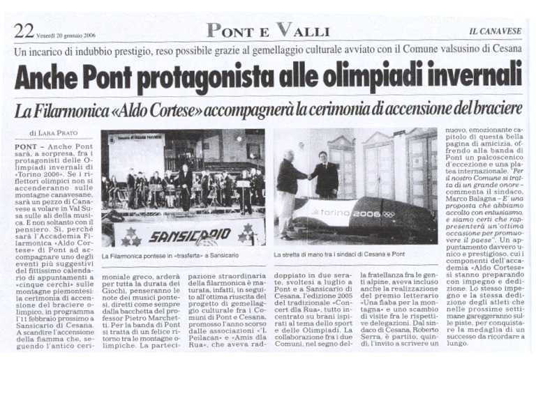 Una delegazione si recherà a Cesana con la Filarmonica "Aldo Cortese" che accompagnerà la cerimonia di accensione del braciere Olimpico.