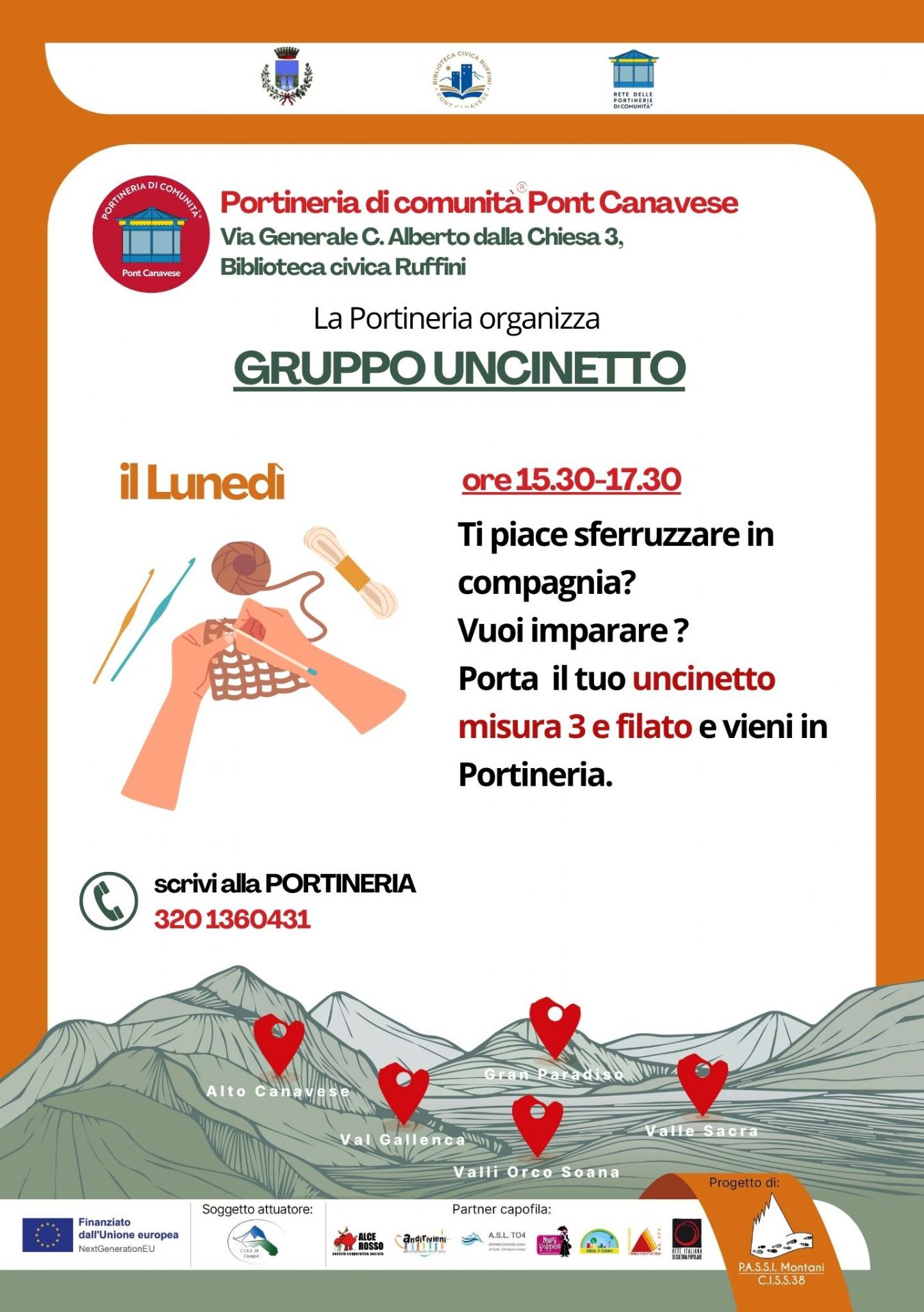 La Portineria di Comunità di Pont Canavese organizza il gruppo di uncinetto, tutti i lunedì dalle 15:30 alle 17:30, presso la Biblioteca Civica Ruffini.