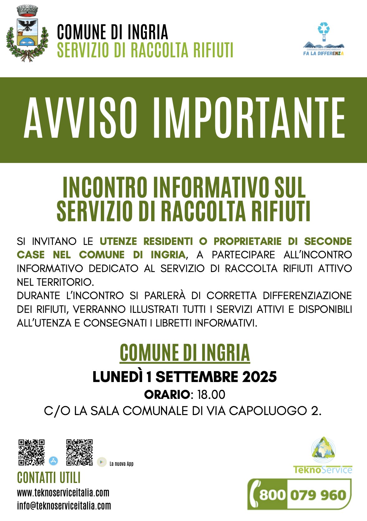 ♻️ Partecipa all'incontro informativo sul servizio di raccolta rifiuti del Comune di Ingria per scoprire tutti i dettagli sulla corretta gestione dei rifiuti.