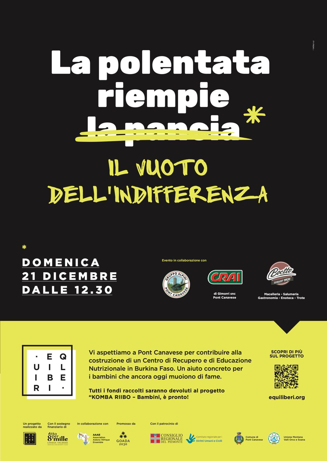 Vi aspettiamo a Pont Canavese per contribuire alla costruzione di un Centro di Recupero e di Educazione Nutrizionale in Burkina Faso. Un aiuto concreto per i bambini che ancora oggi muoiono di fame.