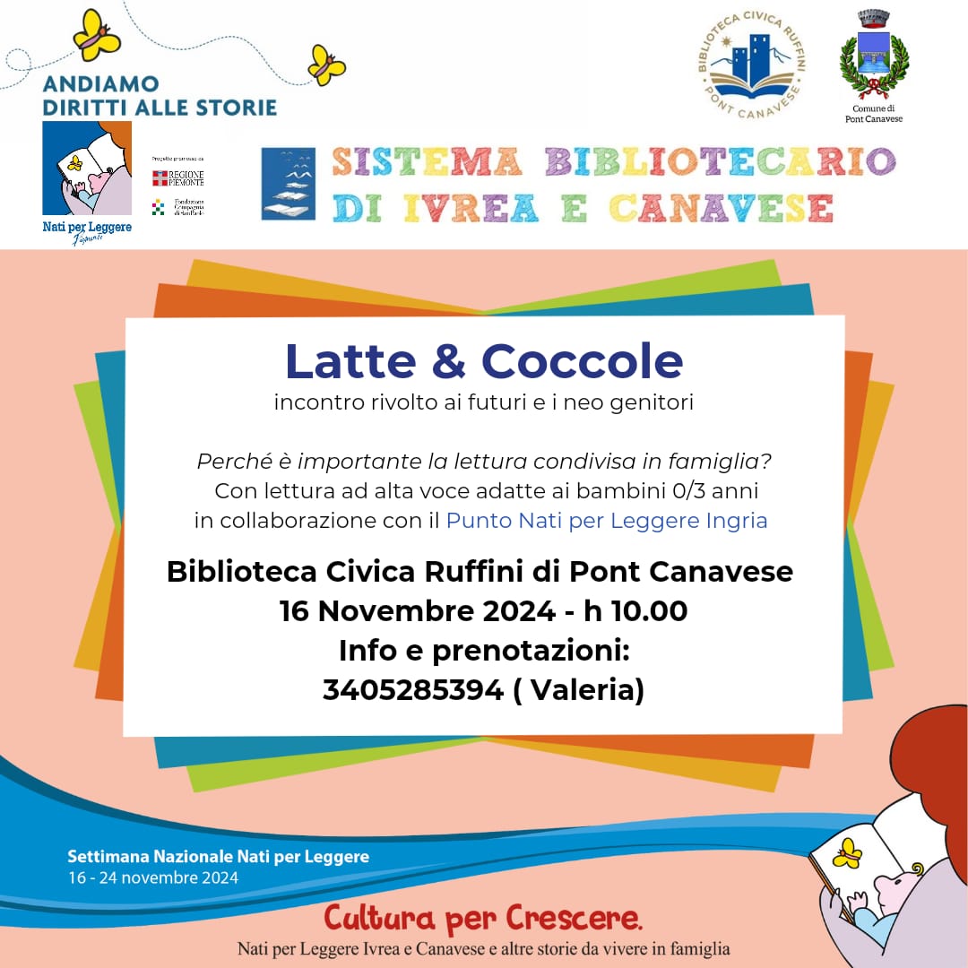 L'incontro, organizzato in collaborazione con il Punto Nati per Leggere di Ingria, in occasione della settimana nazionale "Nati per Leggere", si svolgerà sabato 16 novembre 2024 ore 10:00, presso la Biblioteca di Pont Canavese.