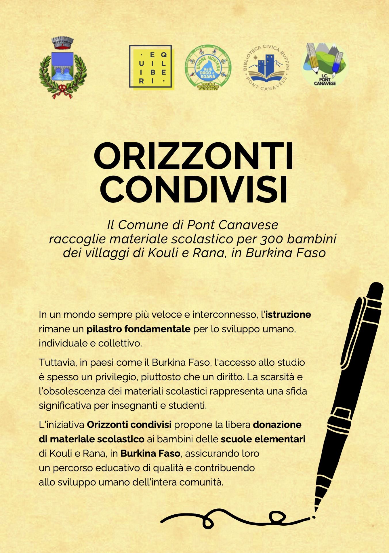 L'assessorato alla cultura del Comune di Pont ha invitato l'Associazione EQUILIBERI e l'Unione montana Valli Orco e Soana a presentare agli studenti del territorio le iniziative di solidarietà in atto in Burkina Faso.