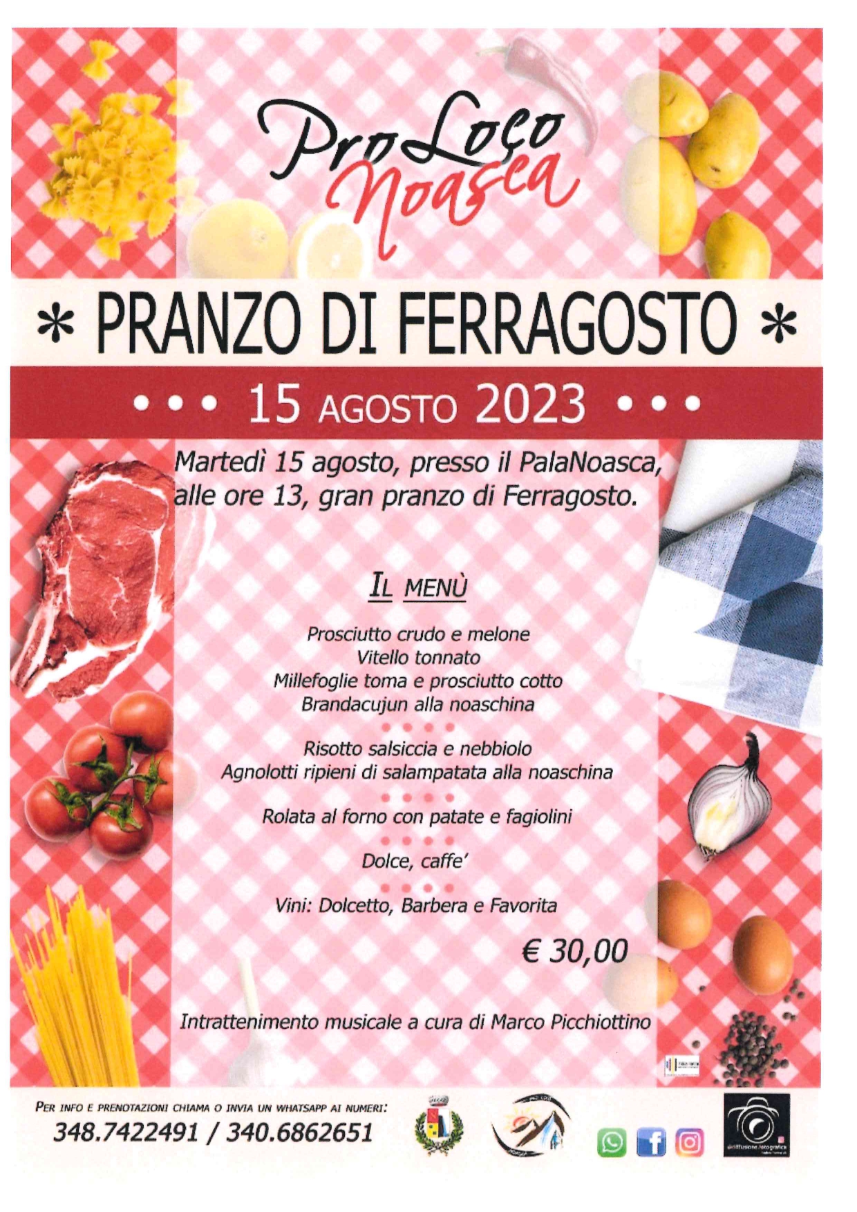 Martedì 15 agosto, presso il PalaNoasca, alle ore 13.00, gran pranzo di Ferragosto.