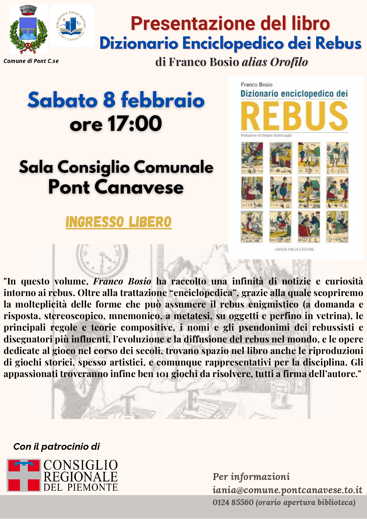 Il Comune di Pont Canavese e la Biblioteca Civica Ruffini vi invitano alla presentazione del libro di Franco Bosio, alias Orofilo, "Dizionario enciclopedico dei rebus" presso la sala Consiliare del Comune, sabato 8 febbraio alle ore 17:00.