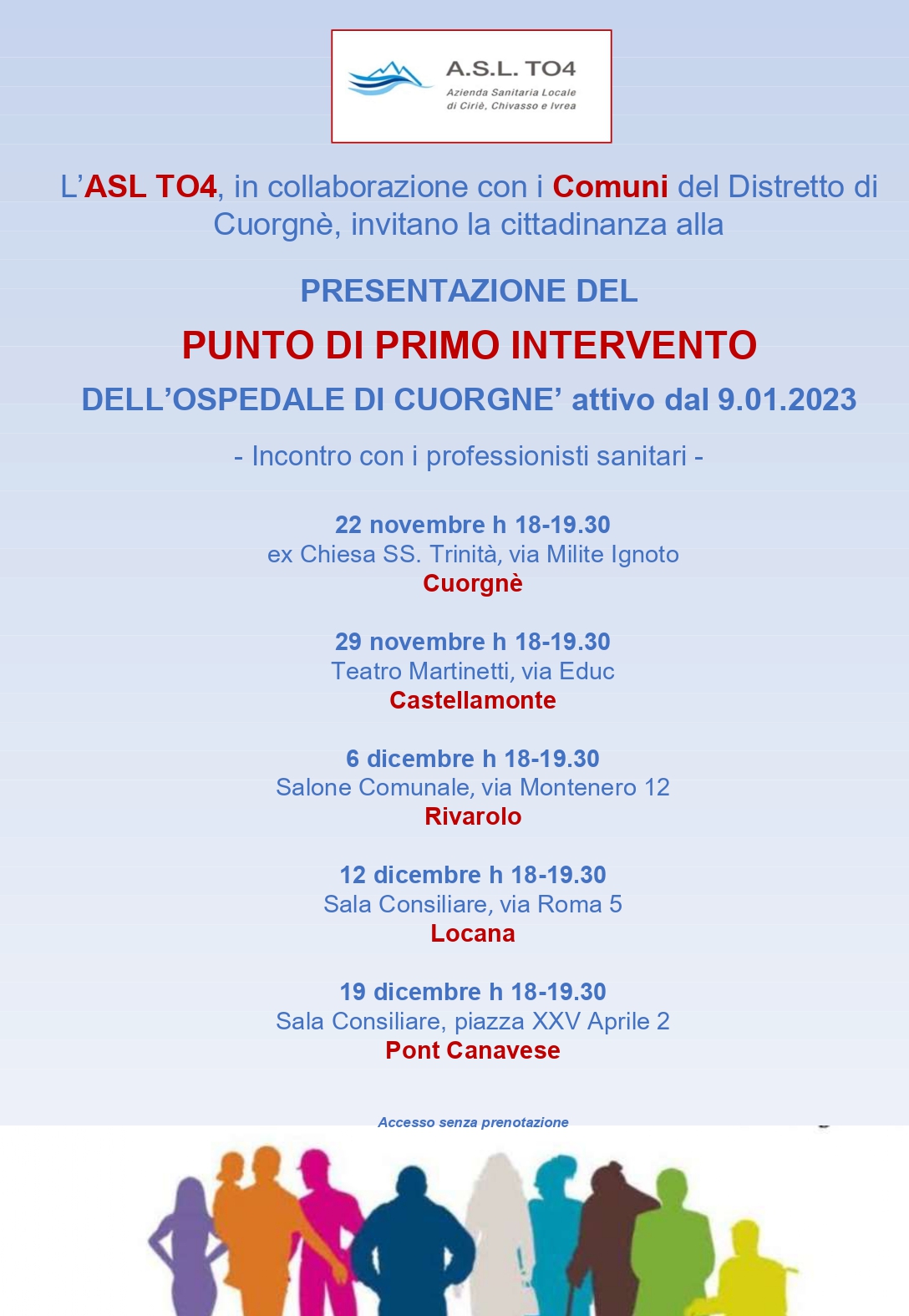 L'ASL TO4 in collaborazione con i Comune del Distretto di Cuorgnè, invitano la cittadinanza alla presentazione del Punto di Primo Intervento dell'Ospedale di Cuorgnè attivo dal 9/01/2023.