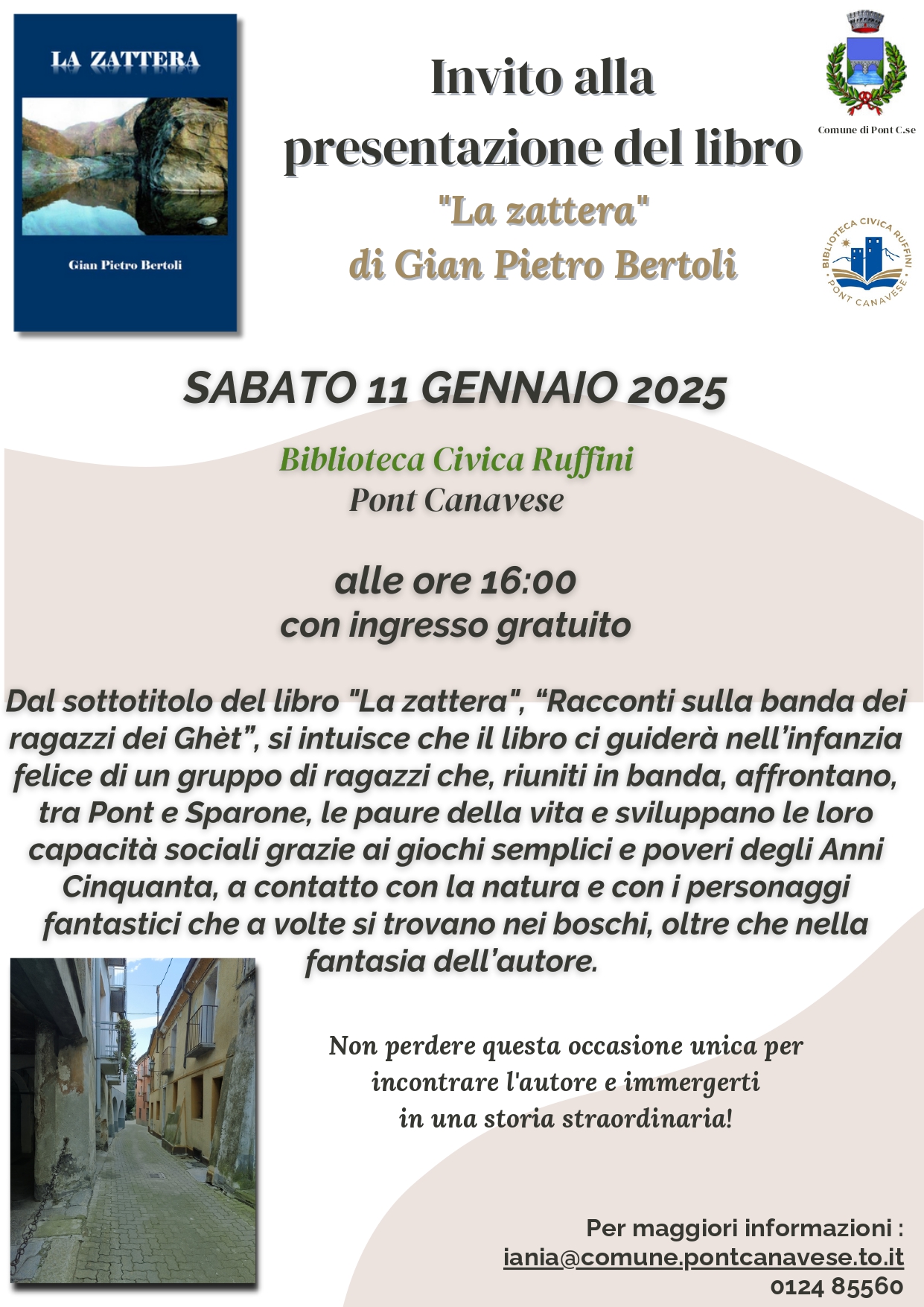 Sabato 11 gennaio alle ore 16.00, presso la Biblioteca Civica Ruffini di Pont Canavese, l'autore Gian Pietro Bertoli presenterà il libro "La zattera".