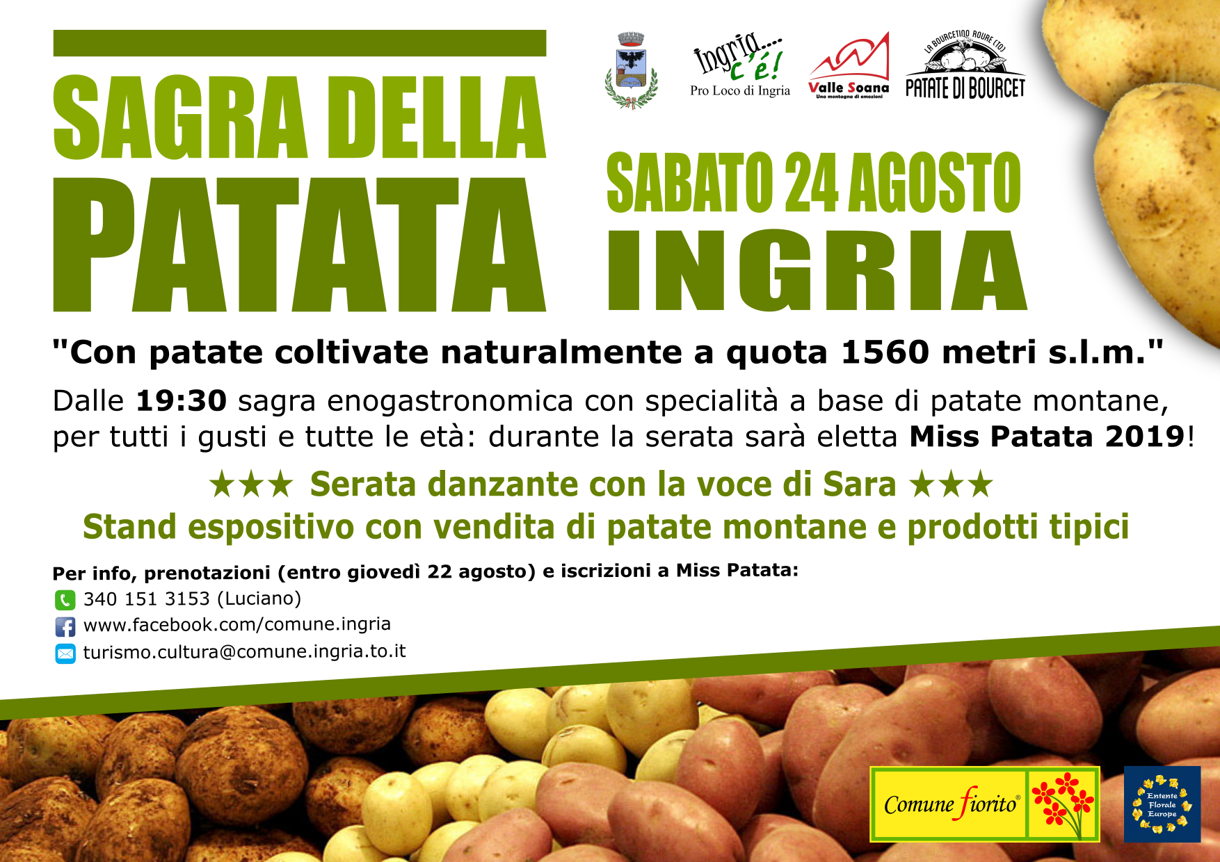 Sabato 24 agosto si terrà a Ingria la consueta Sagra della Patata: a partire dalle ore 19.30 cena con premiazione del concorso Ingriese dei "Balconi Fioriti”.