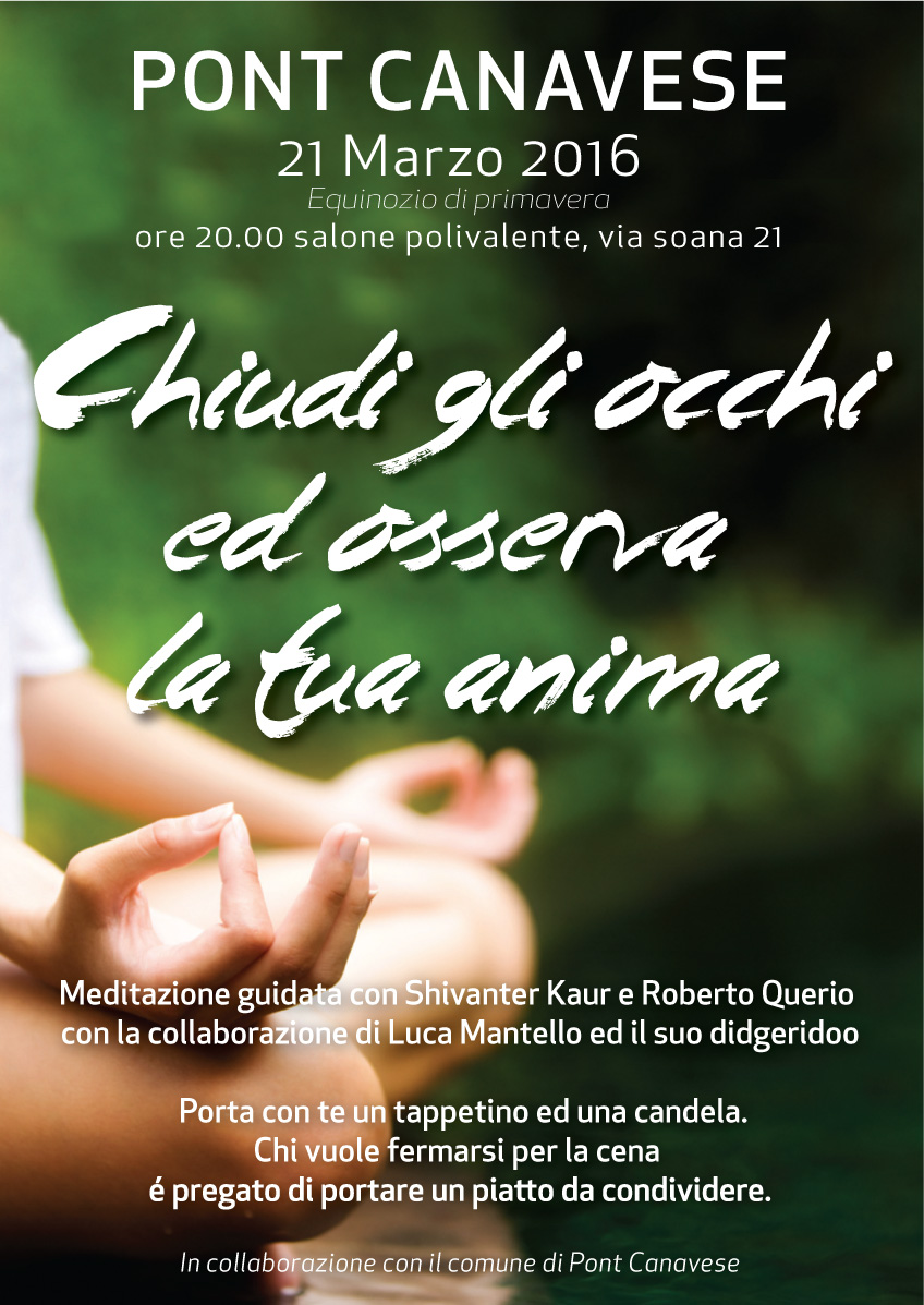 Lunedì 21 marzo alle ore 20.00 presso il salone polivalente di Pont Canavese (in via Soana, 21) serata di meditazione guidata da Shivanter Kaur e Roberto Querio con la partecipazione di Luca Mantello e il suo digeridoo.