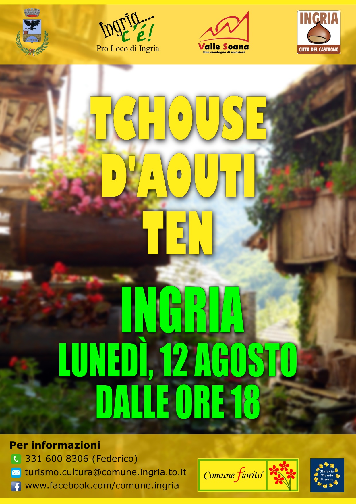 Lunedì 12 agosto Ingria vi invita nelle sua ormai consueta festa francoprovenzale che si svolge dalle 18 fino a notte fonda. Nel caratteristico centro del paese si troveranno le bancarelle degli artigiani, i balli e la musica itinerante: sarà possibile partecipare ai balli tradizionali e ammirare le gigantografie del progetto “Le Case Raccontano”.
