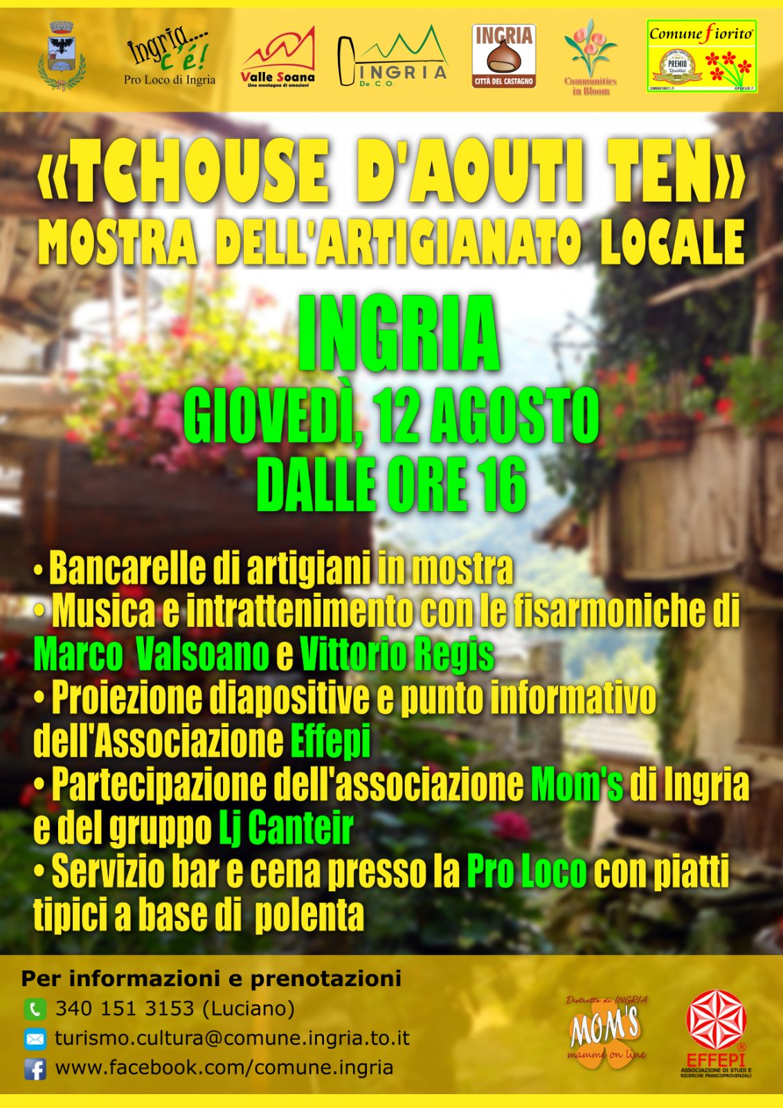 Giovedì 12 agosto Ingria vi invita nelle sua ormai consueta festa francoprovenzale che si svolge dalle ore 16:00 fino a notte fonda. Nel caratteristico centro del paese si troveranno le bancarelle degli artigiani e la musica itinerante.