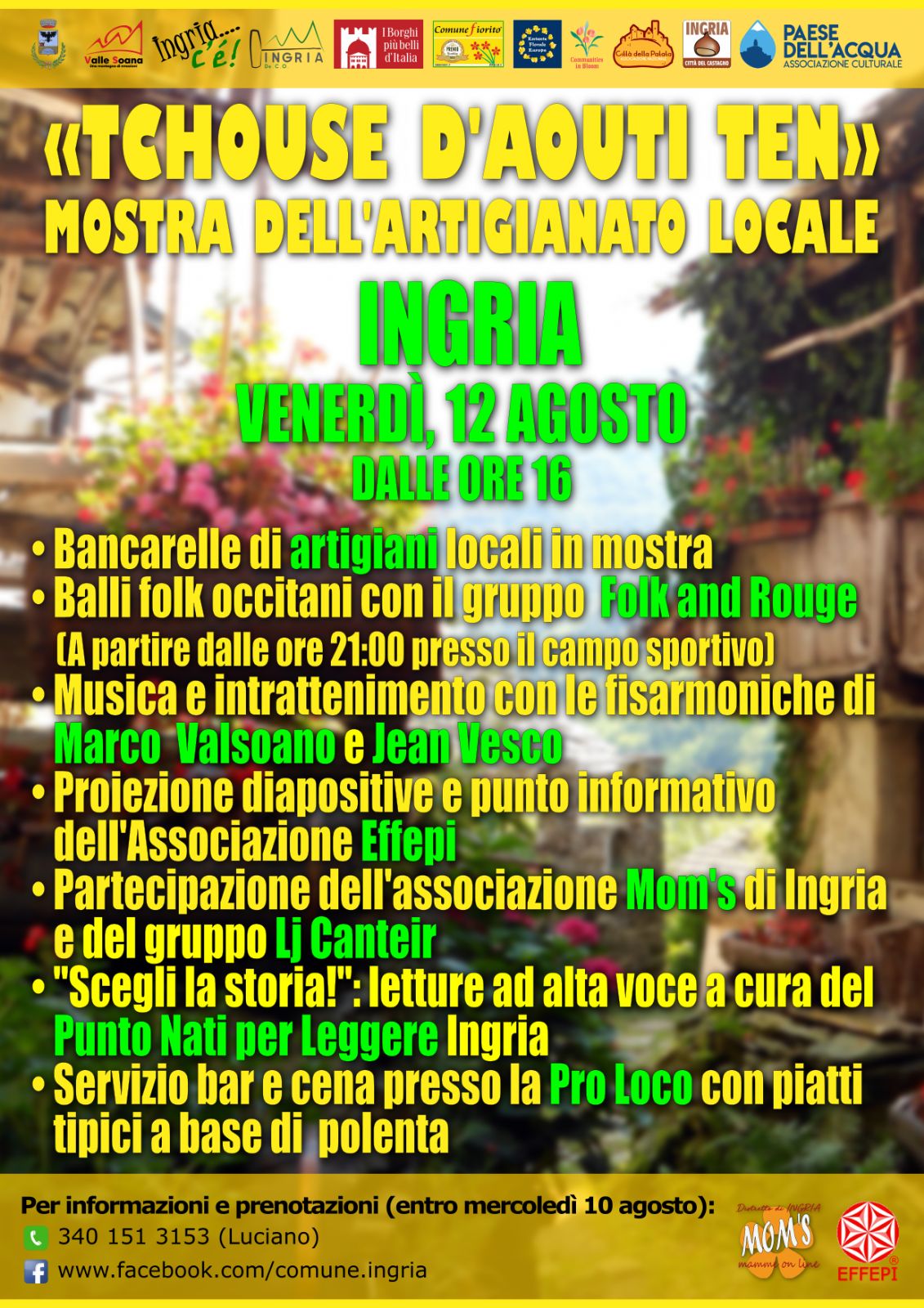 Venerdì 12 agosto Ingria vi invita nelle sua ormai consueta festa francoprovenzale che si svolge dalle ore 16:00 fino a notte fonda. Nel caratteristico centro del paese si troveranno le bancarelle degli artigiani, musica itinerante e balli di gruppo.