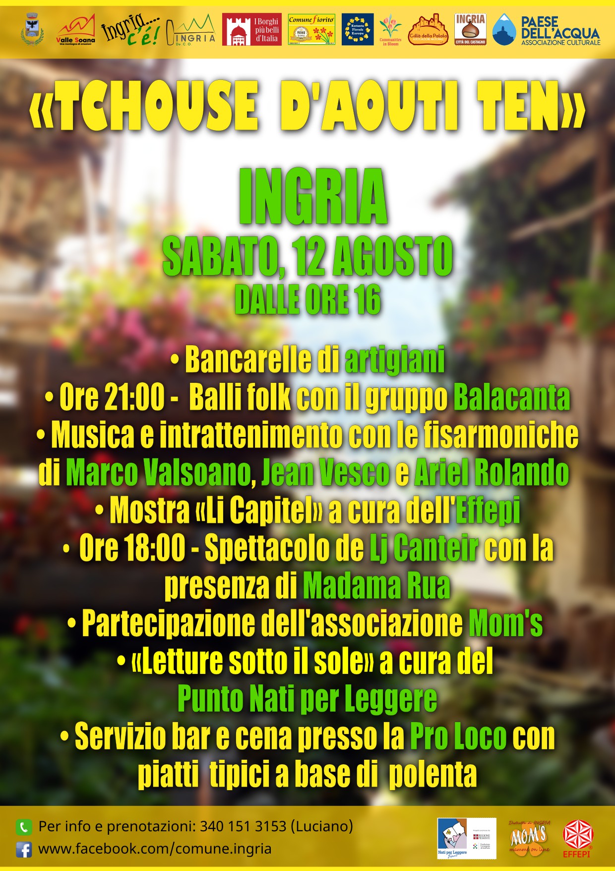 ⏰ Sabato 12 agosto Ingria vi invita nelle sua ormai consueta festa francoprovenzale che si svolge dalle ore 16:00 fino a notte fonda. Nel caratteristico centro del paese si troveranno le bancarelle degli artigiani, musica itinerante e balli di gruppo.