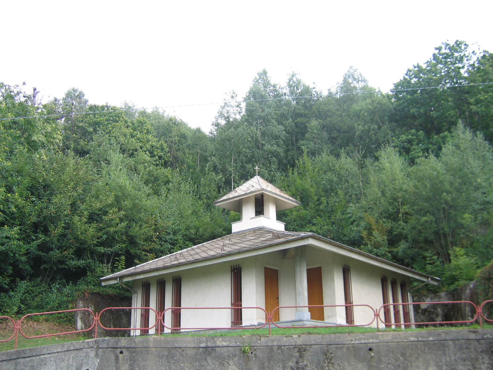 La cappella, una moderna struttura in cemento armato, progettata dall'arch. Carlo Truffa, ben si inserisce nell'anfiteatro naturale in cui è stata posta.