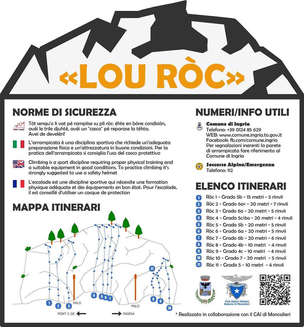 La palestra di roccia «Lou Ròc» offre 11 diversi percorsi con un grado di difficoltà compreso fra 4b e 7.